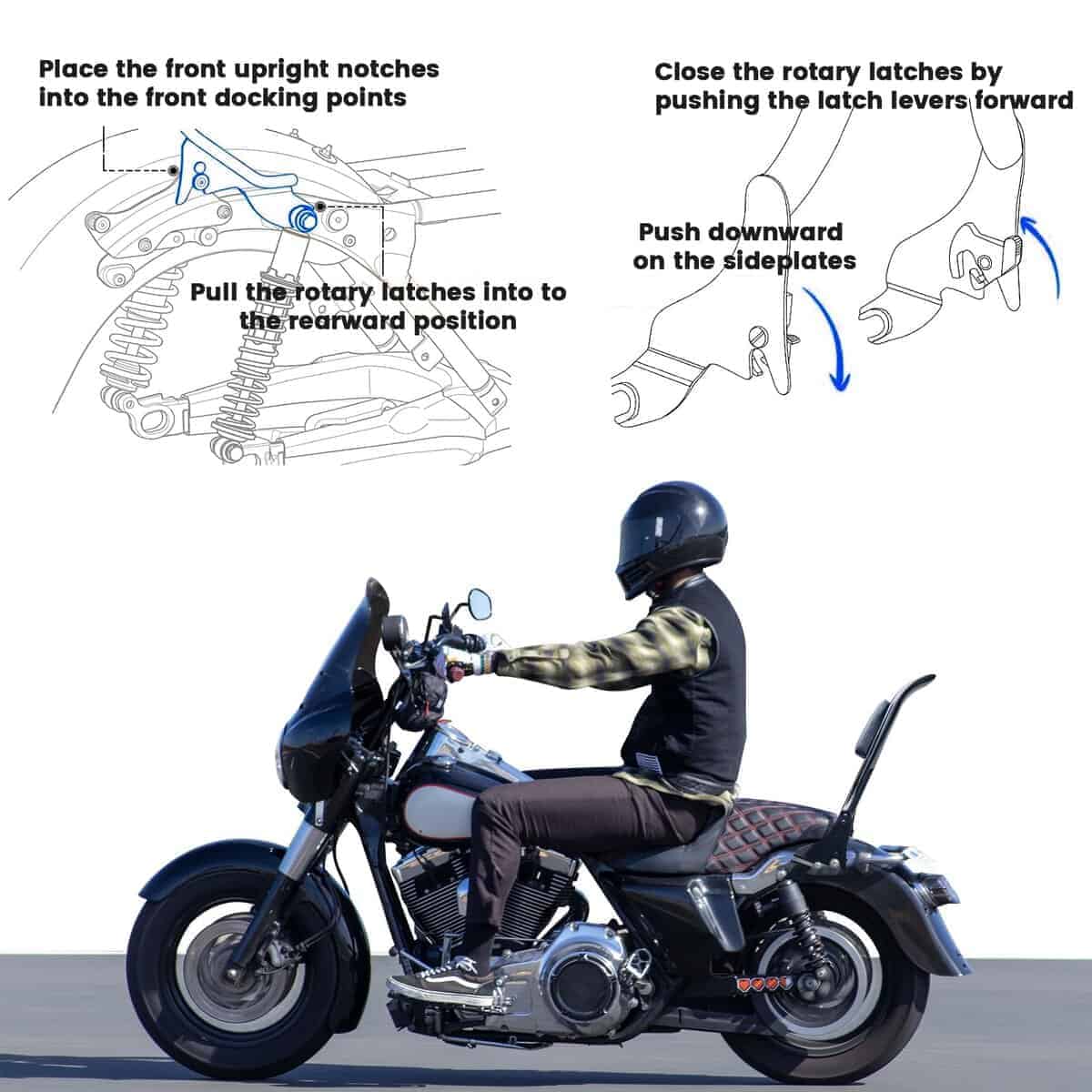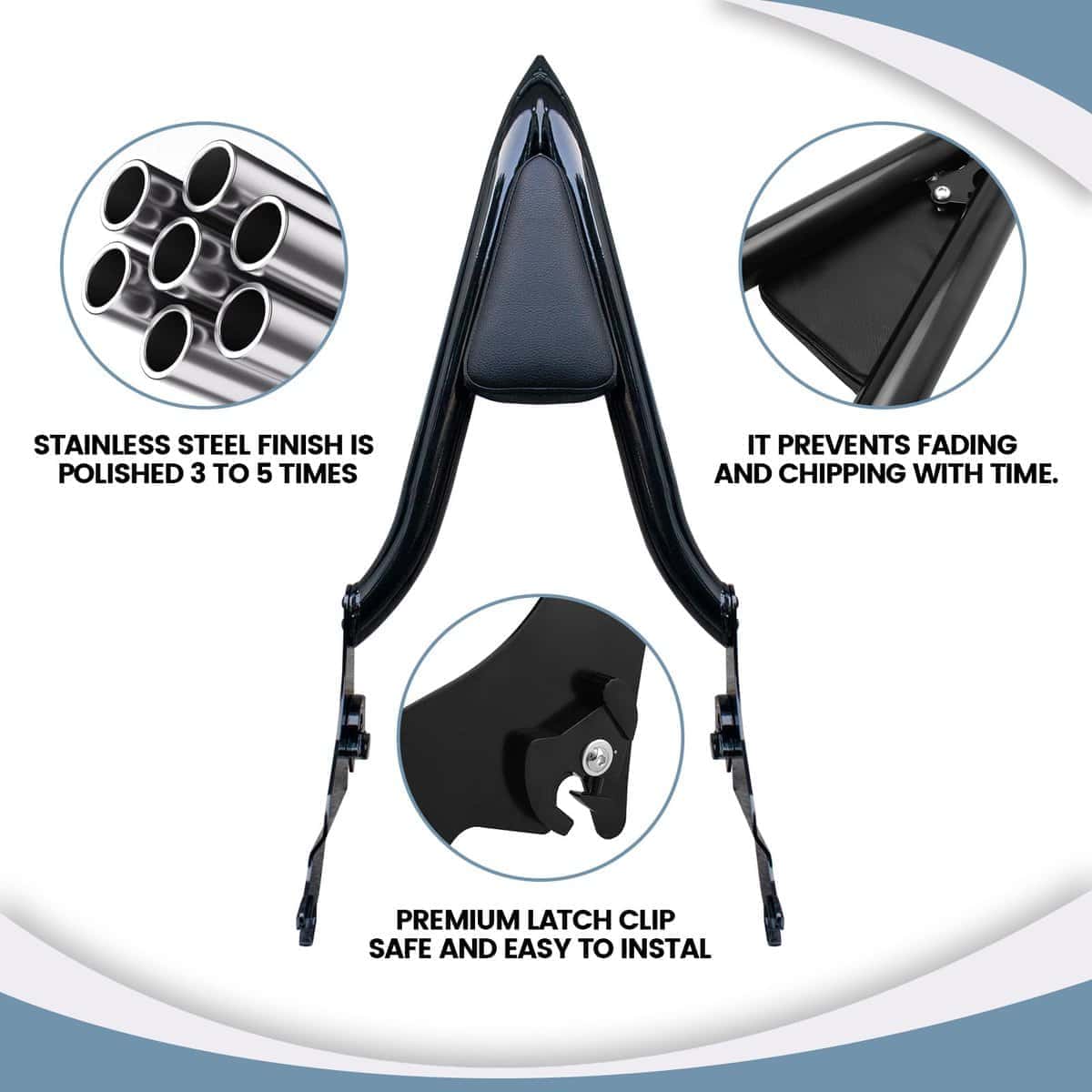 4. Fácil de instalar: Este sissy bar desmontable está diseñado con un exclusivo sistema de pestillo, fácil de instalar y quitar. Puedes instalar o quitar el sissy bar en segundos después del montaje.