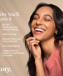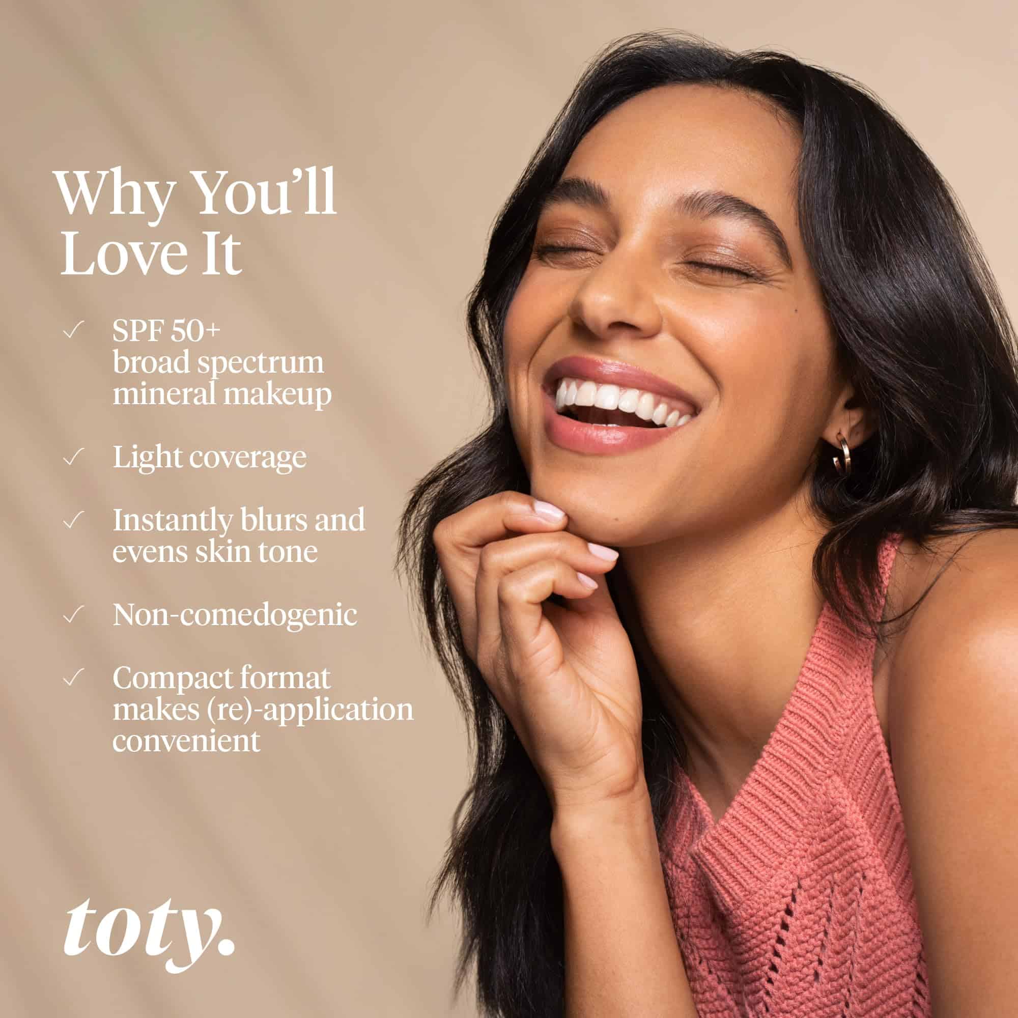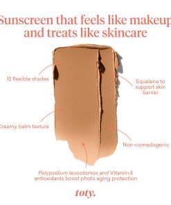 Protector solar + maquillaje + cuidado de la piel 3 en 1: Esta innovadora CC Cream 100% mineral proporciona un protector solar altamente protector de amplio espectro SPF 50+ y también es una base de maquillaje líquida con cobertura media, construible con un hermoso acabado radiante. También ayuda a ocultar el enrojecimiento y equilibrar el tono general de la piel. Esta Base de Maquillaje CC Creamy tiene propiedades antienvejecimiento debido a la mezcla de antioxidantes de Polypodium leucotomos, Té Verde y Vitamina E. Emparejamiento de tonos sin esfuerzo y recambio ecológico: Nuestra tecnología inteligente de adaptación de tonos facilita encontrar tu tono perfecto en tonos de piel claros a profundos. Diseñado por Sofia Vergara, este compacto recargable (solo recambio) es una elección elegante y sostenible, completo con un espejo incorporado y un compartimento de esponja transpirable para su uso en movimientos. Por qué te encantará: ¡Es tu protector solar facial favorito y también el de Sofia! Mantén tu compacto lleno con esta deliciosa base en crema de cobertura ligera, no acartonada ni comedogénica. Ligeramente perfumado. Vegano, libre de crueldad, probado por dermatólogos y libre de parabenos, cada producto Toty es probado por terceros. Soluciones respaldadas por la ciencia: Toty es una marca de cuidado de la piel que reinventa el cuidado solar, la combinación perfecta de belleza y ciencia, una visión de Sofia Vergara y desarrollada clínicamente por Cantabria Labs, líder europeo en cosmecéuticos durante más de tres décadas.