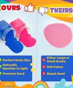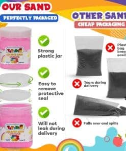 3. Botes de Plástico Reutilizables: Nuestra arena viene en botes de plástico transparentes, gruesos y reutilizables que están sellados con película termoencogible fácil de quitar. Esto asegura que la arena permanezca en cada bote desde el almacén hasta su hogar. Cada bote viene con una tapa fácil de girar, haciendo que el tiempo de juego sea aún más divertido. Estos botes reciclables pueden llevarse a cualquier lugar y son el regalo perfecto.