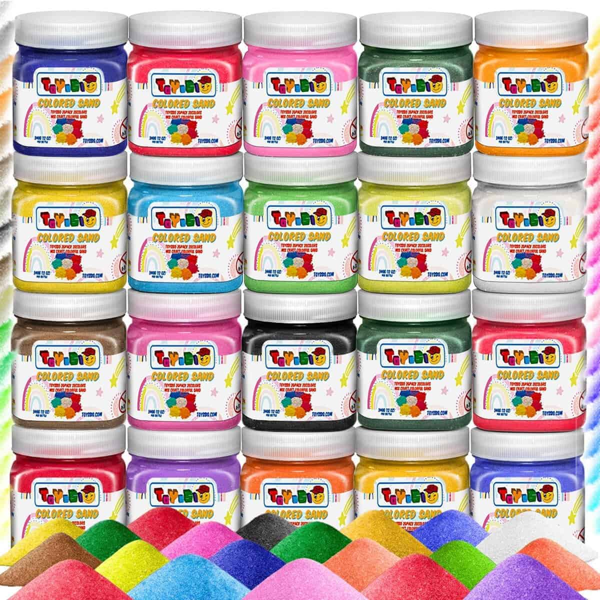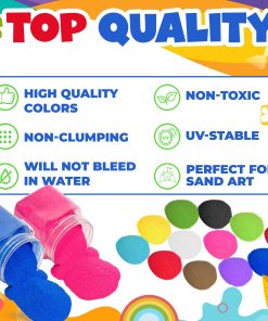 2. Segura y No Tóxica: Nuestra arena de color 100% natural, estable a los rayos UV, no aglomerante de cuarzo es completamente segura de usar. No se desvanecerá, manchará, aglomerará o se disolverá en agua, lo que la hace perfecta para usar en escuelas, salones de clase o incluso al aire libre bajo el sol. Utilice esta arena de colores a granel para proyectos de jarrones, papel de arte adhesivo y fiestas de arte con arena.