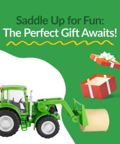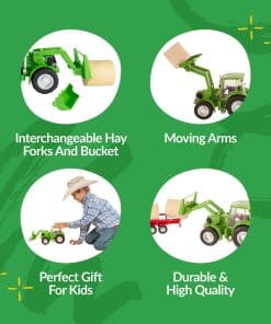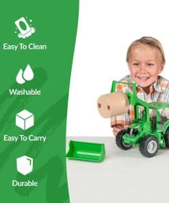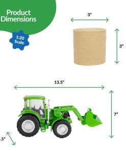 El Tractor y Accesorios se ajustan dentro de la línea completa de juguetes de granja y rodeo en escala 1:20 de Big Country Toys, vehículos, figuras, animales y accesorios. Las características incluyen un enganche trasero para remolcar nuestro Rollo de Paja, brazos delanteros que se mueven hacia arriba y hacia abajo, horquilla de heno y cubo intercambiables, 2 puertas de cabina funcionales y nuestro figurine vaquero cabrá dentro de la cabina (se vende por separado). Incluye 1 paca de heno con agujeros. Hecho de nuestra mezcla patentada de plástico que crea juguetes duraderos y realistas. Tamaño (pulgadas): Tractor – 14″ x 6″ x 6.75″ (L x W x H) Paja – 3″ x 3″. Big Country Toys: Diseñamos, comercializamos y distribuimos una creciente línea de juguetes de granja, rodeo y aventura en escala 1:20, juguetes saltarines de granja y rodeo, y libros para niños basados en la Biblia.