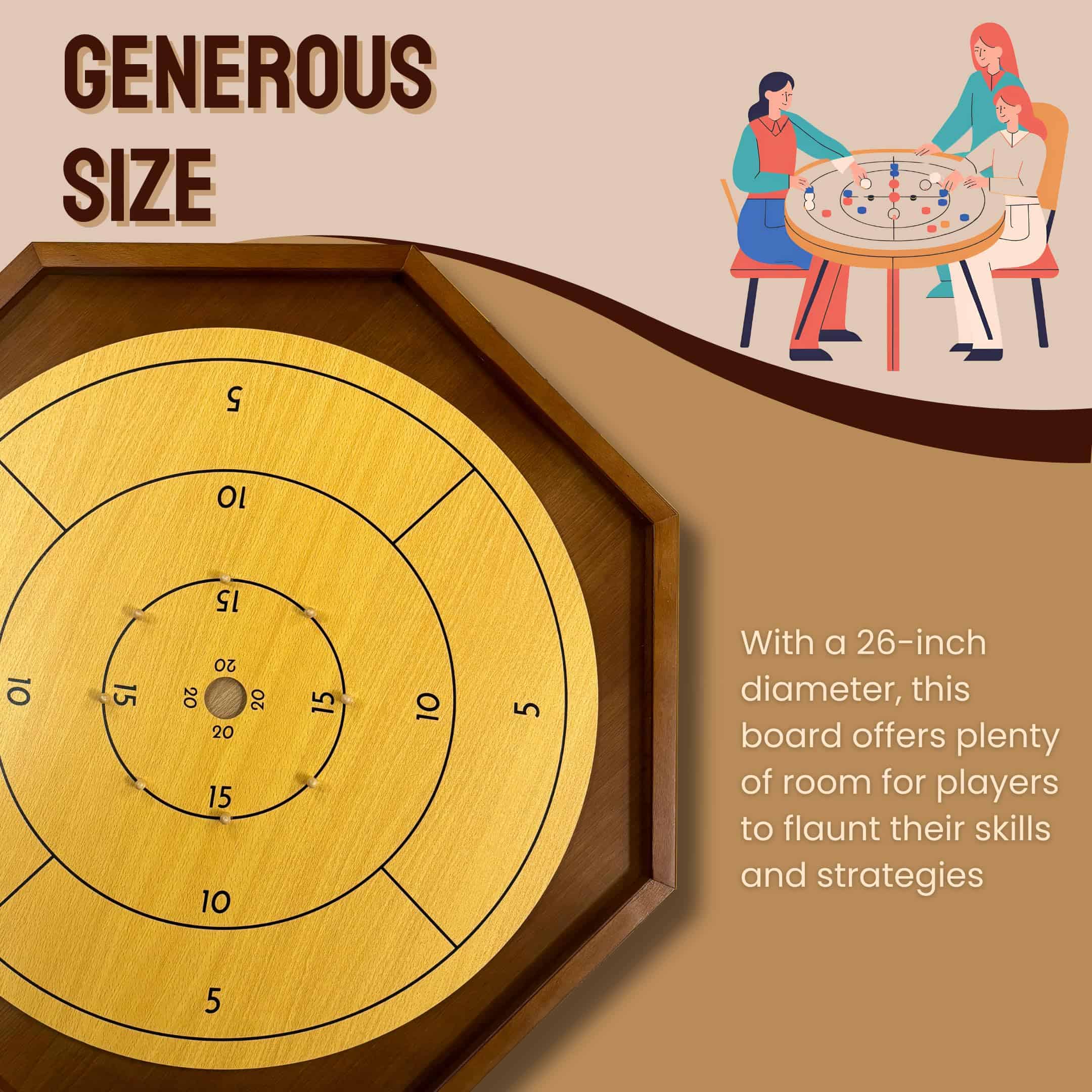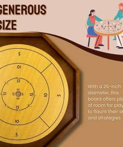 El tablero de juego tiene una estética rústica y sencilla con una hermosa construcción de madera y acabado para permitir deslizamientos a larga distancia para tus discos. El juego implica que los jugadores se turnen para lanzar un disco hacia el centro del tablero, sin embargo, después de que el primer disco esté en el tablero, el jugador debe golpear otro disco en turnos posteriores. De lo contrario, debes descartar tu disco y no cuenta puntos.