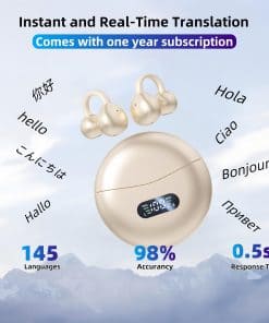 3. Traducción en Tiempo Real Avanzada Impulsada por IA: Nuestros auriculares traductores con IA admiten traducción instantánea bidireccional en más de 144 idiomas y 70 dialectos. Con algoritmos de IA avanzados, la precisión de la traducción mejora con el tiempo, convirtiéndolos en una herramienta esencial para viajes internacionales, reuniones de negocios y fines educativos. Estos auriculares traductores de idiomas proporcionan una comunicación fluida, incluso sin conexión a Internet, gracias a los paquetes de idiomas offline disponibles para compra dentro de la aplicación.