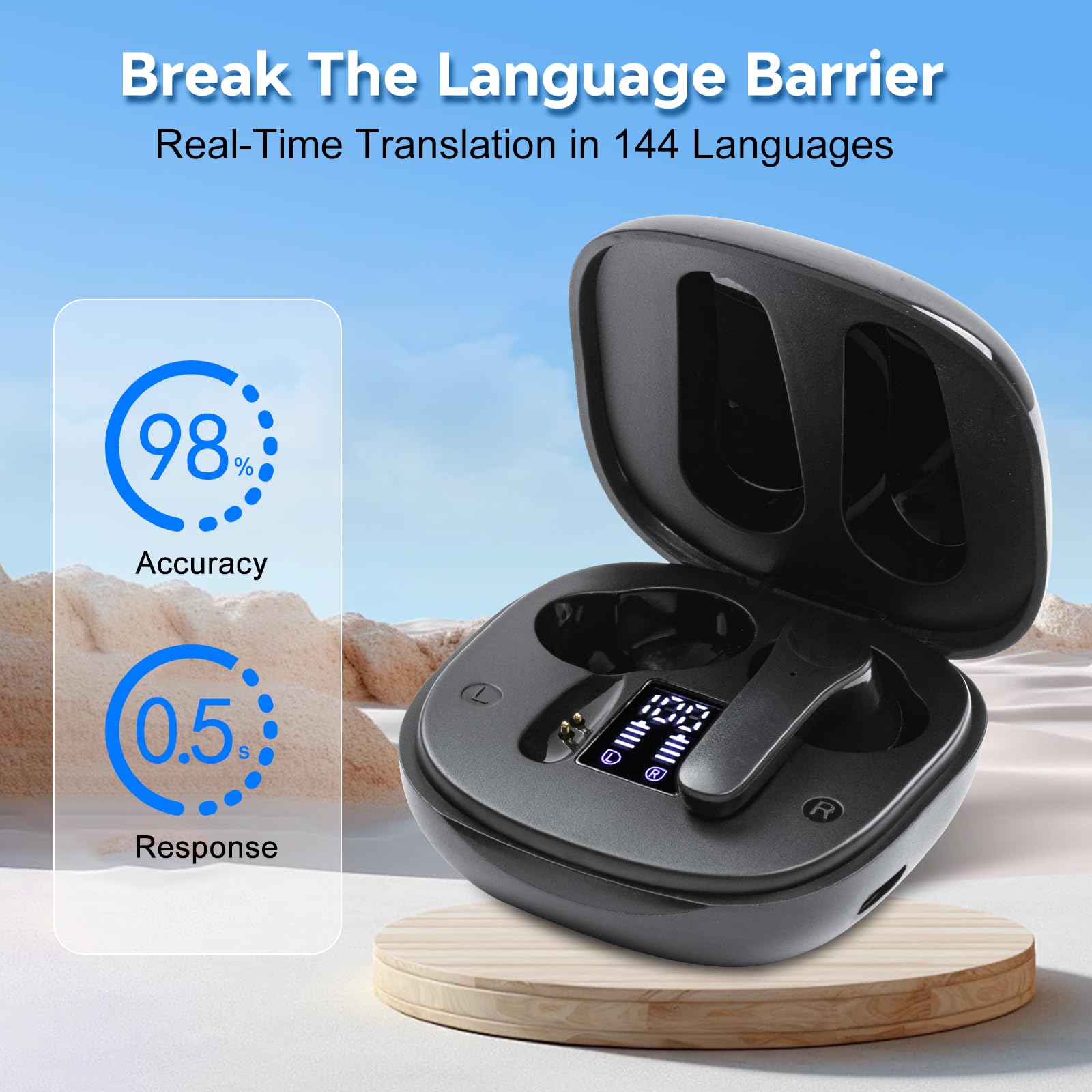 Auriculares de traducción que responden rápidamente en tan solo 0.5 segundos con una tasa de precisión del 98%, logrando una traducción rápida y precisa en conversaciones multilingües a través de auriculares internos.