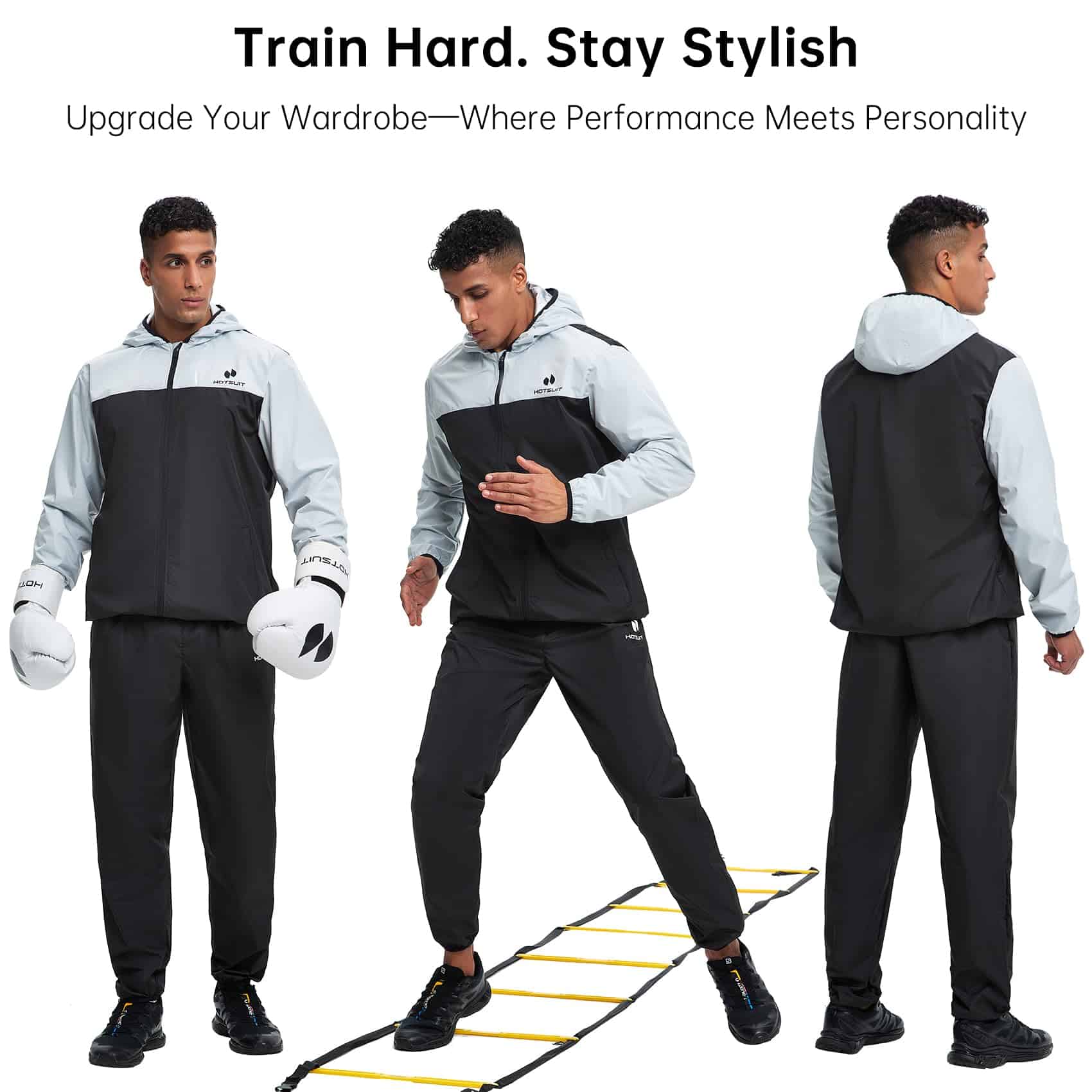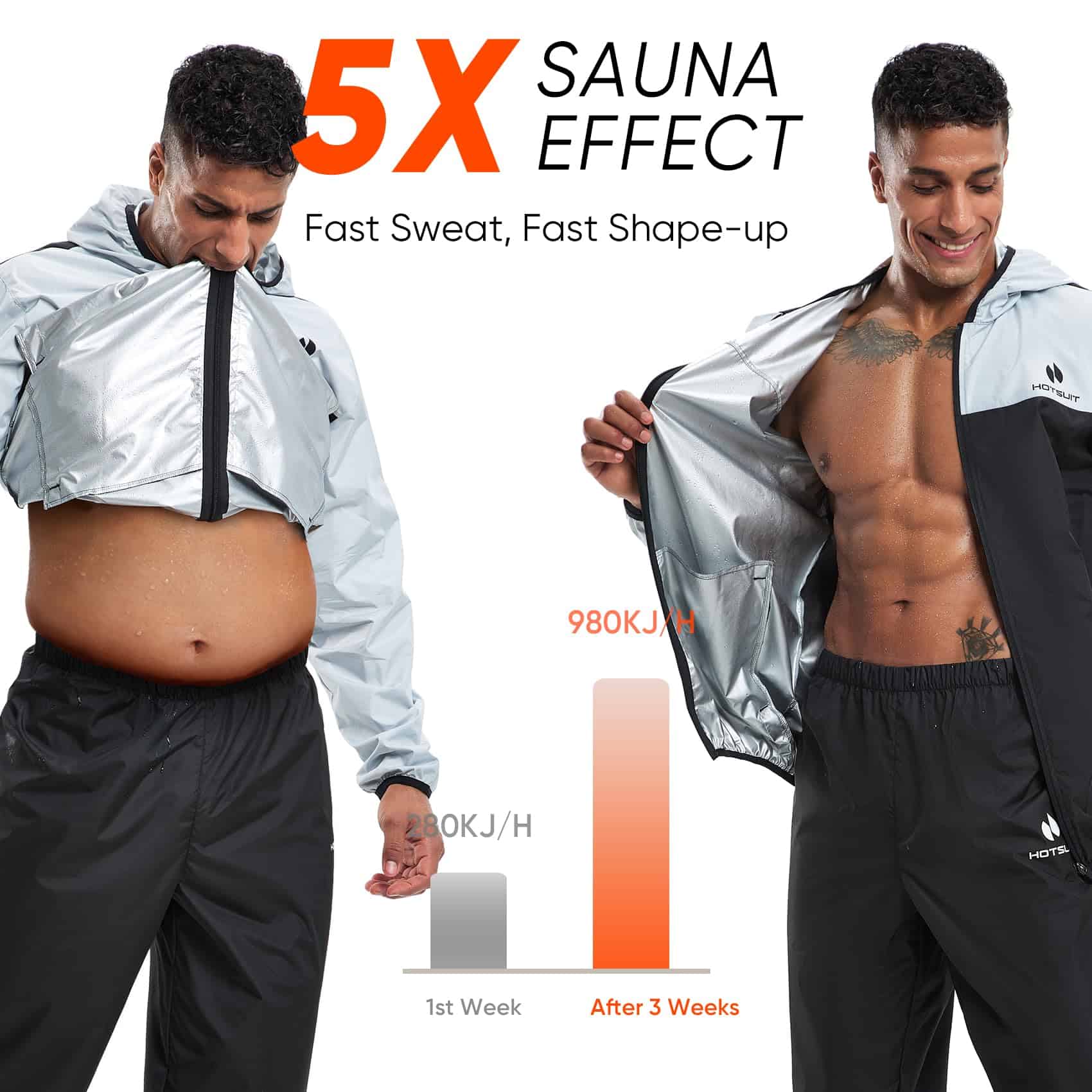 El nuevo modelo de trajes de sauna de HOTSUIT está diseñado para hombres que desean maximizar sus entrenamientos sudando más y quemando más calorías. Este traje de sauna de alta calidad está hecho con una tela resistente y ligera que refleja el calor de vuelta al cuerpo para promover la sudoración. Con un diseño elegante y funcional, este traje incluye una chaqueta de sauna y pantalones de sauna que son ideales para usar en el gimnasio, correr al aire libre, hacer ejercicio con equipos, y más.