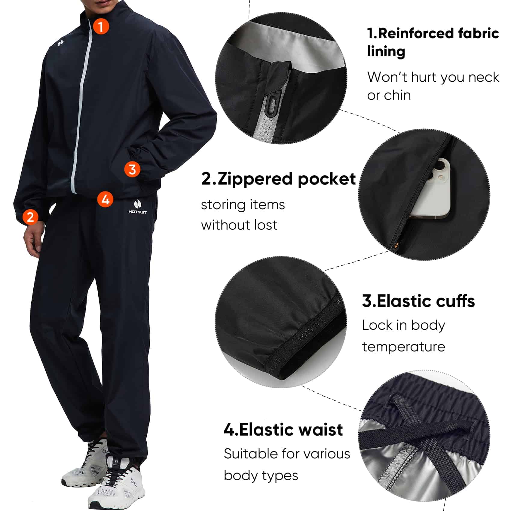 El traje de sauna HOTSUIT para hombres está diseñado para brindar resultados óptimos durante el ejercicio. Con su tela de alta tecnología, puede promover una sudoración intensa para maximizar la absorción de calor, aumentar la quema de calorías y acelerar la pérdida de peso. Además, el traje de sauna es impermeable y a prueba de viento, lo que te permite mantenerte cálido y seco durante cualquier actividad al aire libre. Su material anti-olor y anti-desgarro garantiza un rendimiento duradero, sin importar la intensidad del ejercicio. Además, los bolsillos con cremallera ofrecen conveniencia durante el entrenamiento, y su diseño elegante lo hace adecuado para una variedad de actividades deportivas. No pierdas la oportunidad de experimentar los beneficios de este traje de sauna de alta calidad para maximizar tu rendimiento y alcanzar tus objetivos de peso con estilo.
