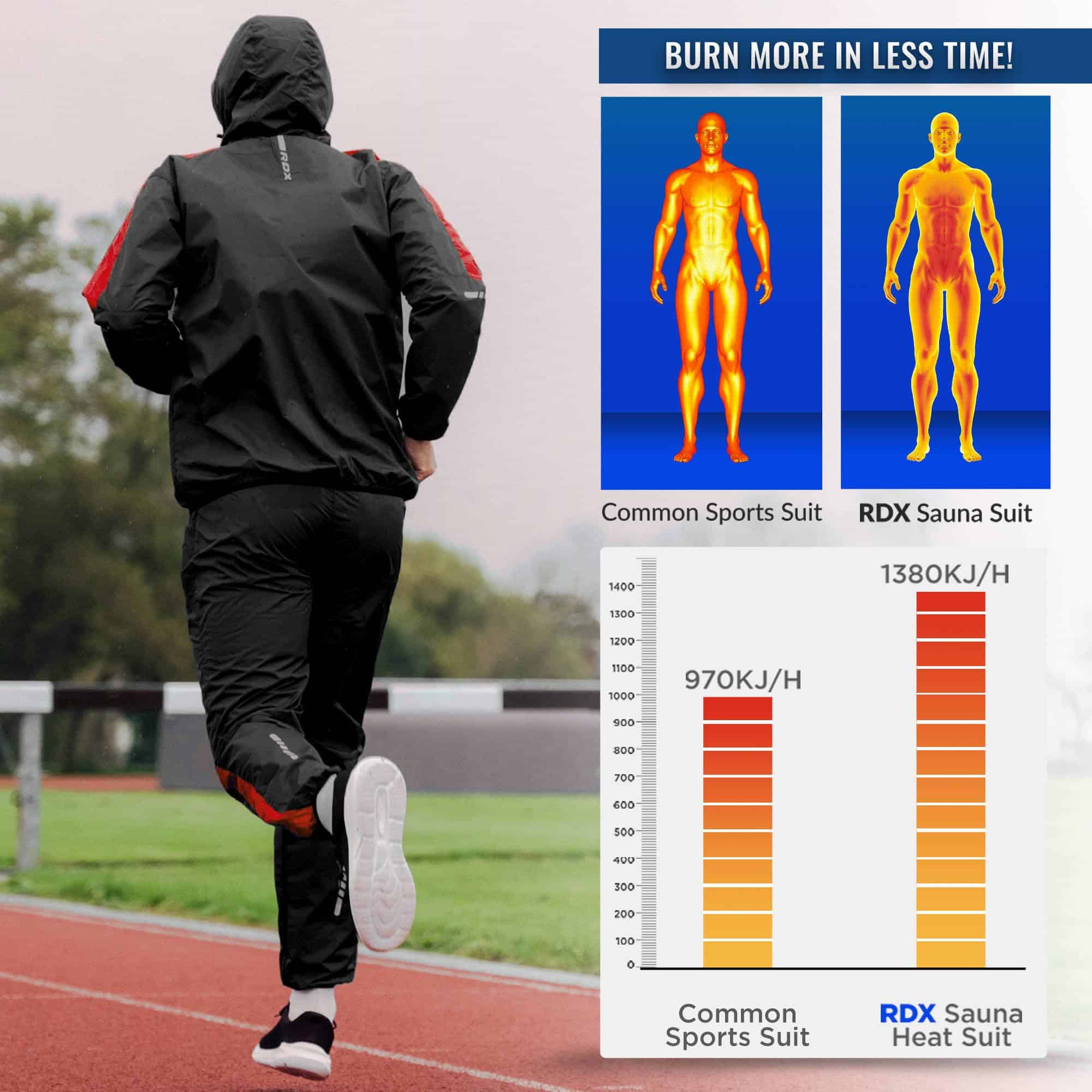 Traje de sauna de retención de calor de cuerpo entero mejorado: Eleva la efectividad de tu entrenamiento con el traje de sauna de cuerpo completo de RDX, diseñado meticulosamente para crear un microclima que garantiza una retención de calor superior. Con puños elásticos, una robusta cremallera invertida y una gorra elástica, todo diseñado para maximizar la retención de calor. Este traje de sudor asegura una aislamiento óptimo, manteniendo tu calor contenido para potenciar la sudoración durante el ejercicio, correr, trotar, andar en bicicleta, etc. ¡Potencia y acelera tu entrenamiento con RDX!