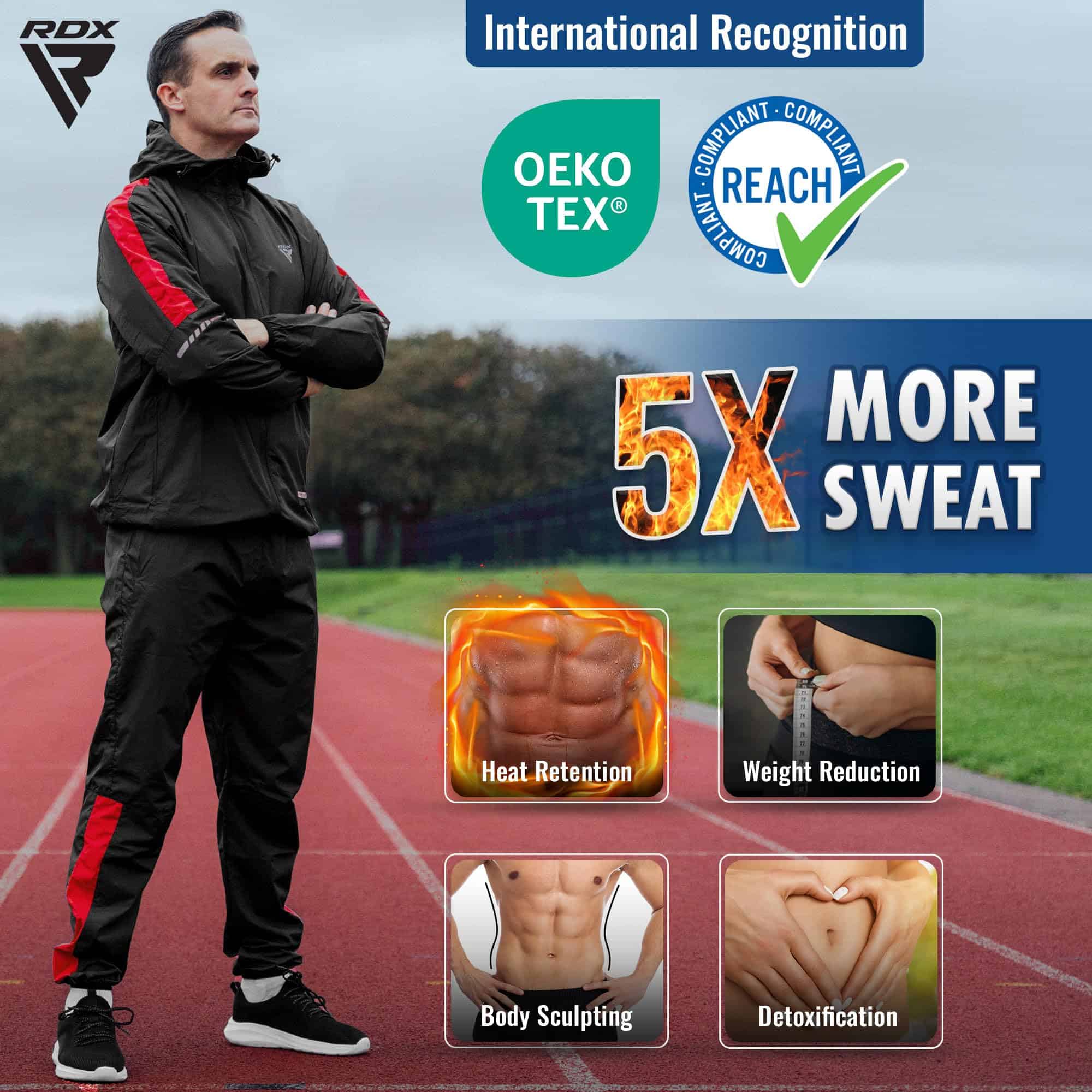 Tela certificada OEKO TEX 100 para retener el calor: El traje de sauna RDX H1 está fabricado con una tela exclusiva certificada OEKO TEX 100 y conforme a REACH, para una óptima aislamiento térmico durante los entrenamientos. Esta innovadora tela está diseñada para apoyar un régimen de corte de peso óptimo cuando se combina con la dieta y el ejercicio adecuados, lo que te hará sentir más atractivo y empoderado mientras mejora tu experiencia de entrenamiento.