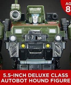 La figura Autobot Hound WFC-S9 presenta un diseño de batalla inspirado en la historia y está equipado con un accesorio de arma W-5 Holo-Beam Refraction Blaster y un accesorio de arma RT-10 IR Electro-Scope Launcher. Los 2 accesorios de armas se bloquean juntos para formar el Mega-Blaster HD Vector-Beam más grande. Múltiples puertos de armas del Sistema C.O.M.B.A.T. en modos de robot y vehículo permiten a los fanáticos unir armas a la figura en configuraciones de armas personalizadas. Transformers y todos los personajes relacionados son marcas comerciales de Hasbro.