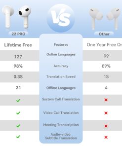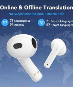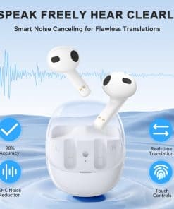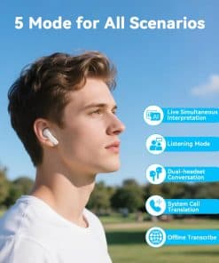 6. Sonido claro y comodidad durante todo el día: cancelación activa de ruido para una traducción nítida. Diseño ergonómico y ligero para un ajuste sin presión. 5 horas de uso con 1 hora de carga, 24 horas de duración de la batería con estuche de carga, 90 días en espera, convirtiendo los auriculares traductores en un compañero ideal para viajes, reuniones de negocios, conferencias y ferias comerciales.