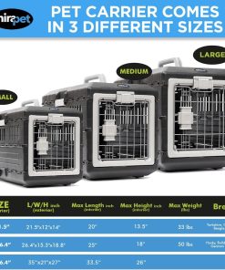 Mirapet USA: Transportadora (21.5″ L x 12″ W x 14″ H) ¡Asegúrate de que tus mascotas tengan un viaje más seguro y cómodo con Mirapet! Nuestras transportadoras de diseño robusto de plástico duro te brindan lo mejor en portabilidad ligera y protección. Las paredes son plegables, por lo que toda la transportadora es fácil de almacenar y mantener fuera del camino cuando no está en uso, ¡pero se configura en segundos sin necesidad de herramientas! ¡Lo mejor de todo es que está listo para viajar en avión! Nuestras transportadoras están aprobadas por las aerolíneas y TSA para que puedas realizar tu viaje con confianza. Siempre lo Mejor A diferencia de otras cajas, jaulas y perreras de paredes duras, la Transportadora Mirapet tiene amplias aberturas en todos los lados para mantener a tu mascota fresca y darles visibilidad y flujo de aire para su comodidad. Los perros y gatos, los cachorros y gatitos curiosos adorarán las ventilaciones frescas y poder mirar hacia los lados. Todo el cuerpo está diseñado para ser fácil de limpiar y mantener. Cuando la caja está en modo de almacenamiento, se puede bloquear en su lugar para que sea fácil de mover con el asa superior. Hecho Para Tus Mascotas Nuestra jaula pequeña mide 21.5″ de largo x 12″ de ancho x 14″ de alto. Este tamaño es perfecto para perros extra pequeños y de juguete, la mayoría de los gatos, y para el transporte de cachorros o gatitos. Es bueno para otros animales pequeños pero no diminutos, como conejos, hurones, iguanas, erizos, ardillas, cobayos, hámsters, entre otros. Nuestras transportadoras también están disponibles en un tamaño grande que debería ajustarse a perros medianos.