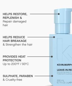KEVIN.MURPHY LEAVE-IN.REPAIR es un tratamiento de keratina que proporciona una intensa reparación y nutrición para el cabello. Con la ventaja adicional de la protección térmica, este tratamiento ayuda a reducir la rotura del cabello y fortalecerlo, dejándolo brillante y manejable. La fórmula sin sulfatos y parabenos, además de ser libre de crueldad, lo hace ideal para todo tipo de cabello. Con LEAVE-IN.REPAIR de KEVIN.MURPHY, puedes proteger tu cabello del calor hasta 200 F / 93 C, manteniendo su brillo natural y suavidad. ¡Cuida tu cabello con los productos de alta calidad de KEVIN.MURPHY y disfruta de resultados de salón en la comodidad de tu hogar!