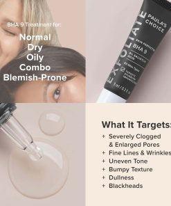El BHA 9 Skin Perfecting es una fórmula dirigida única y absolutamente excepcional para imperfecciones rebeldes, es su solución cuando nada más ha funcionado para eliminar visiblemente sus preocupaciones cutáneas más difíciles. Este funciona rápidamente para eliminar visiblemente la apariencia de imperfecciones molestas. Tiene un pH óptimo de 3.2-3.6. Este tratamiento ofrece un 9% de BHA en una fórmula de liberación controlada para un alisado máximo de la piel y resultados notables. Este gel-serum funciona maravillas para mejorar la apariencia de preocupaciones cutáneas tenaces, como poros dilatados, poros obstruidos, protuberancias, múltiples signos de envejecimiento y parches de piel áspera y seca. Todos los productos de Paula’s Choice son 100% libres de fragancia, clínicamente probados para no ser irritantes y nunca probados en animales.