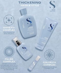 Una loción espesante y voluminizadora para el cabello con acción revitalizante que nutre el cabello. El tratamiento capilar profesional agrega cuerpo y volumen y brinda protección térmica de hasta 445 grados. La fibra capilar recupera su espesor y vitalidad, para una apariencia joven y saludable. El producto está especialmente formulado para cabello envejecido y delgado. Tu cabello se verá más lleno, grueso y revitalizado. Es delicado para el cuero cabelludo y el cabello, y seguro para cabello coloreado. Incluye 6 ampollas de un solo uso. Los productos de cuidado capilar Semi di Lino Density son fórmulas veganas que no contienen ingredientes de origen animal y derivados. El champú es una fórmula biodegradable, y el empaque está hecho de plástico reciclado y reciclable, fabricado en Italia. La fragancia de base biológica, con notas polvosas y afrutadas, es de origen natural y se obtiene gracias a fuentes renovables. Los productos Density de Semi di Lino contienen cinco complejos únicos de ingredientes activos que protegen y revitalizan el cabello. El Complejo Filler contiene aminácidos y péptidos que actúan para dar volumen y espesor al cabello fino que ha perdido su cuerpo natural. Los aminoácidos penetran dentro de la fibra capilar, nutriendo y reforzando la estructura para que el cabello pueda recuperar una apariencia saludable. El péptido crea un efecto barrera para proteger el cabello y las propiedades antioxidantes promueven el bienestar del cuero cabelludo para un cabello más joven. El Complejo Climate-Proof proporciona una barrera protectora, mantiene el cabello hidratado y lo protege de las condiciones climáticas debido a la humedad y la temperat