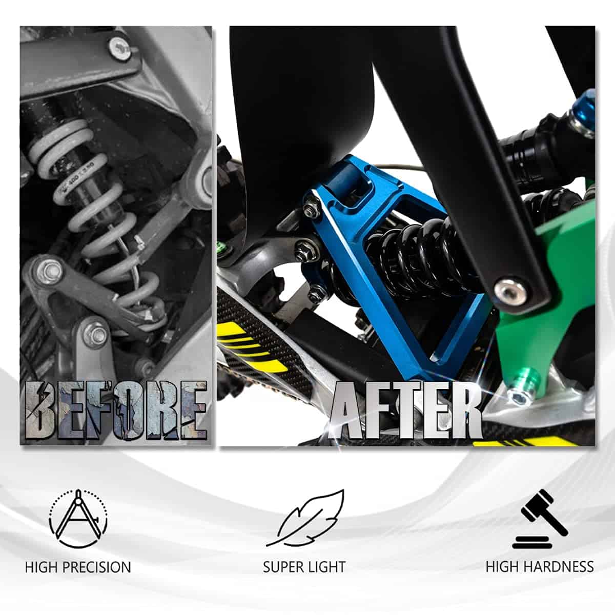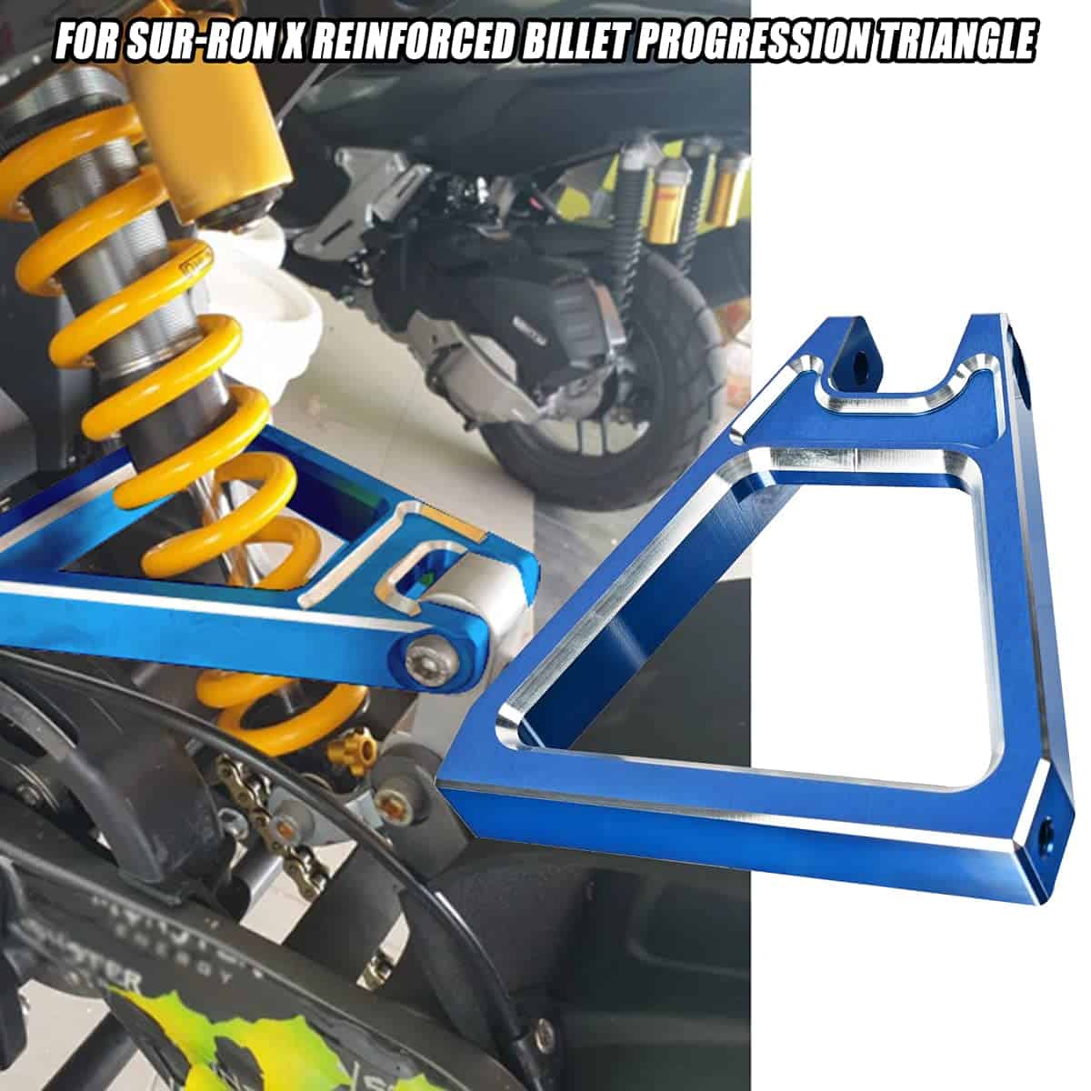 El triángulo de suspensión LINK ORIGINALCompatible con Sur Ron Light Bee S/X para Segway X160 X260 para Ebike, es un elemento que soporta una gran presión durante saltos y otras actuaciones fuera de carretera. La pieza de fábrica está hecha de un material de aluminio relativamente barato que puede romperse en 2 piezas diferentes después de soportar una carga excesiva al aterrizar. El triángulo de suspensión está hecho de aluminio forjado 7075, anodizado, este triángulo trasero reforzado reemplaza al enlace de aluminio fundido que es propenso a fallas bajo estrés intenso. Es duradero y resistente al desgaste, superficie anodizada, opciones de colores variados, colores brillantes y diseños únicos pueden decorar tu sur ron muy bien. No afecta el funcionamiento de la suspensión, mejor combinado con el enlace trasero reforzado, el triángulo de progresión Sur-Ron es un elemento que soporta una gran presión durante saltos y otras actuaciones fuera de carretera, no se oxidará ni corroerá, no se romperá. El cojinete adopta un cojinete de alta precisión y se instala un sello de aceite en el canto exterior para evitar la entrada de sedimentos y el desbordamiento de aceite lubricante interno. Muy fácil de instalar. Simplemente aprieta los tornillos, se puede completar en pocos minutos. Reemplaza el Kit de enlace de suspensión original. Estructura multimolde con sección de soporte de presión reforzada que puede soportar hasta 2.3 veces la presión instantánea original. El triángulo de suspensión es la mejora perfecta para tu motocicleta. En gran medida, evita la carga excesiva al aterrizar que las piezas se rompan en dos. El triángulo de suspensión puede hacerte sentir más tranquilo fuera de la carretera. Mejora la estabilidad y realza el rendimiento de manejo.