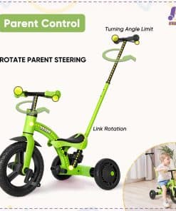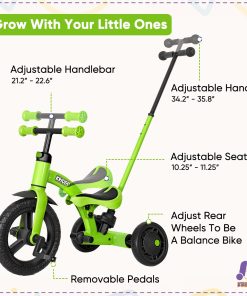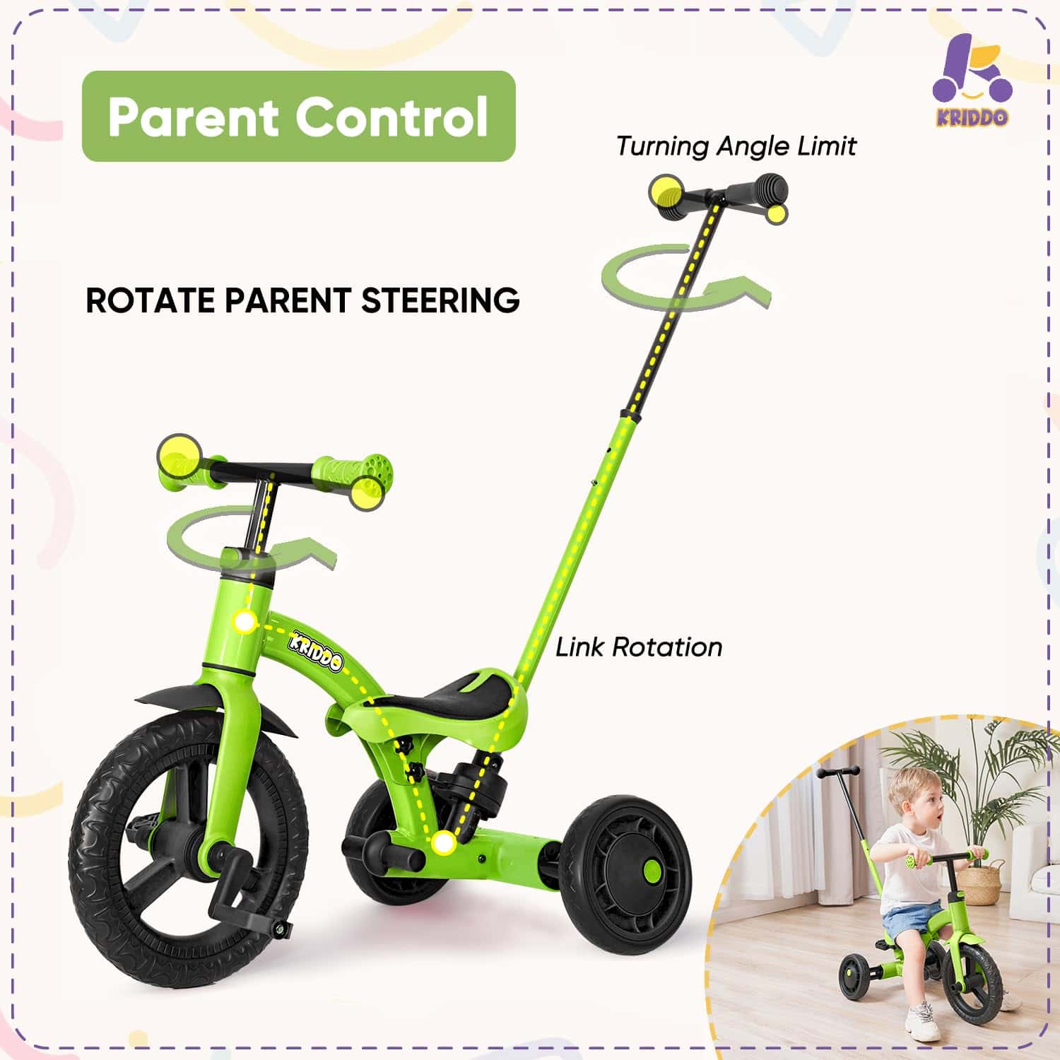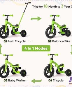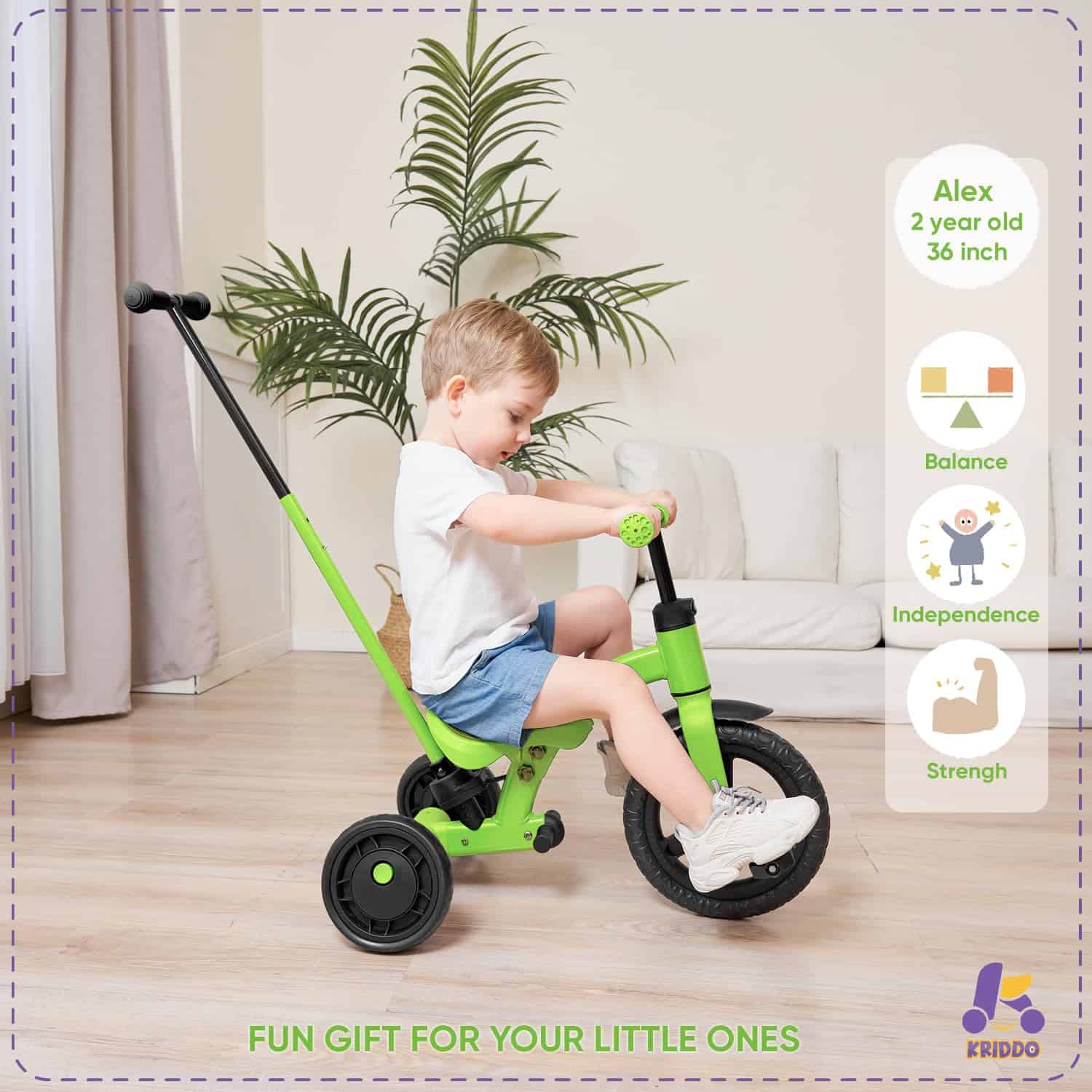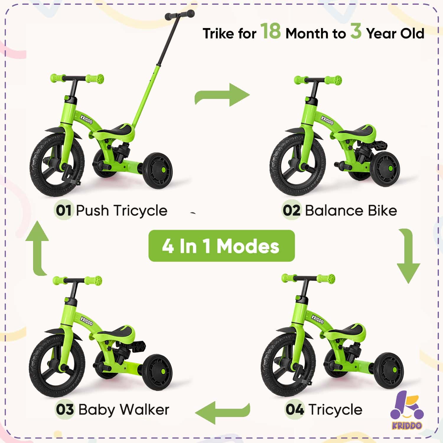 Triciclo para niños KRIDDO 4 en 1 con manillar de empuje para padres. Ideal para niños de 1.5 a 3 años. Cuenta con rueda delantera de 12 pulgadas, bicicleta de equilibrio para niños de 18 meses a 3 años, altura ajustable y color verde. Este triciclo ofrece diferentes modos para que los niños se diviertan y jueguen. Cuenta con un diseño inteligente que previene la caída con ruedas traseras extendidas, base más amplia y dirección limitada a 60 grados. La rueda delantera absorbe los impactos para mayor estabilidad y seguridad. Asiento amplio y cómodo con agarres antideslizantes para mayor soporte durante el juego activo.