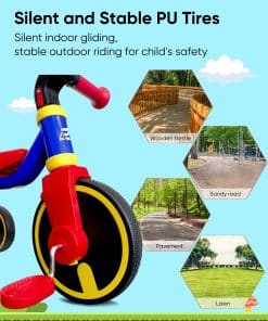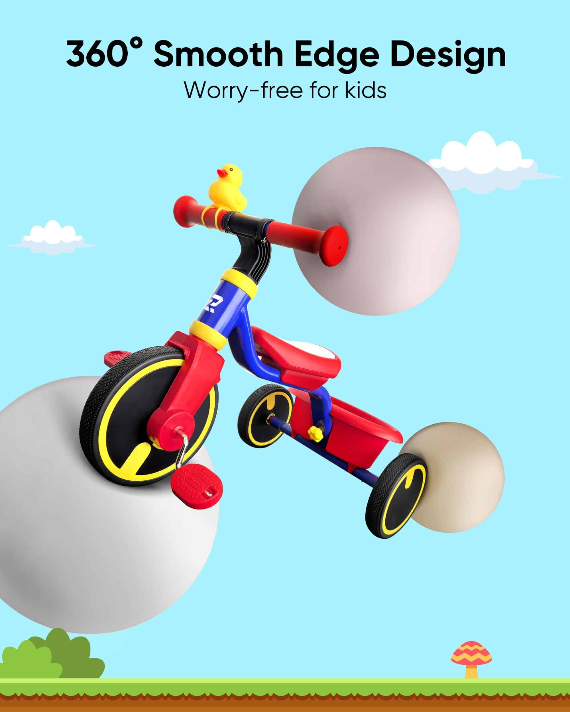 1. Diseño seguro y amigable para principiantes: diseñado con bordes suaves y redondeados y sin partes afiladas, este triciclo garantiza que tu pequeño se mantenga a salvo de lesiones. Sin tornillos expuestos que puedan causar arañazos, es la elección perfecta para niños de 1 a 3 años.