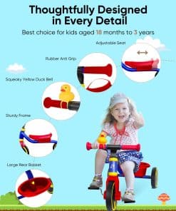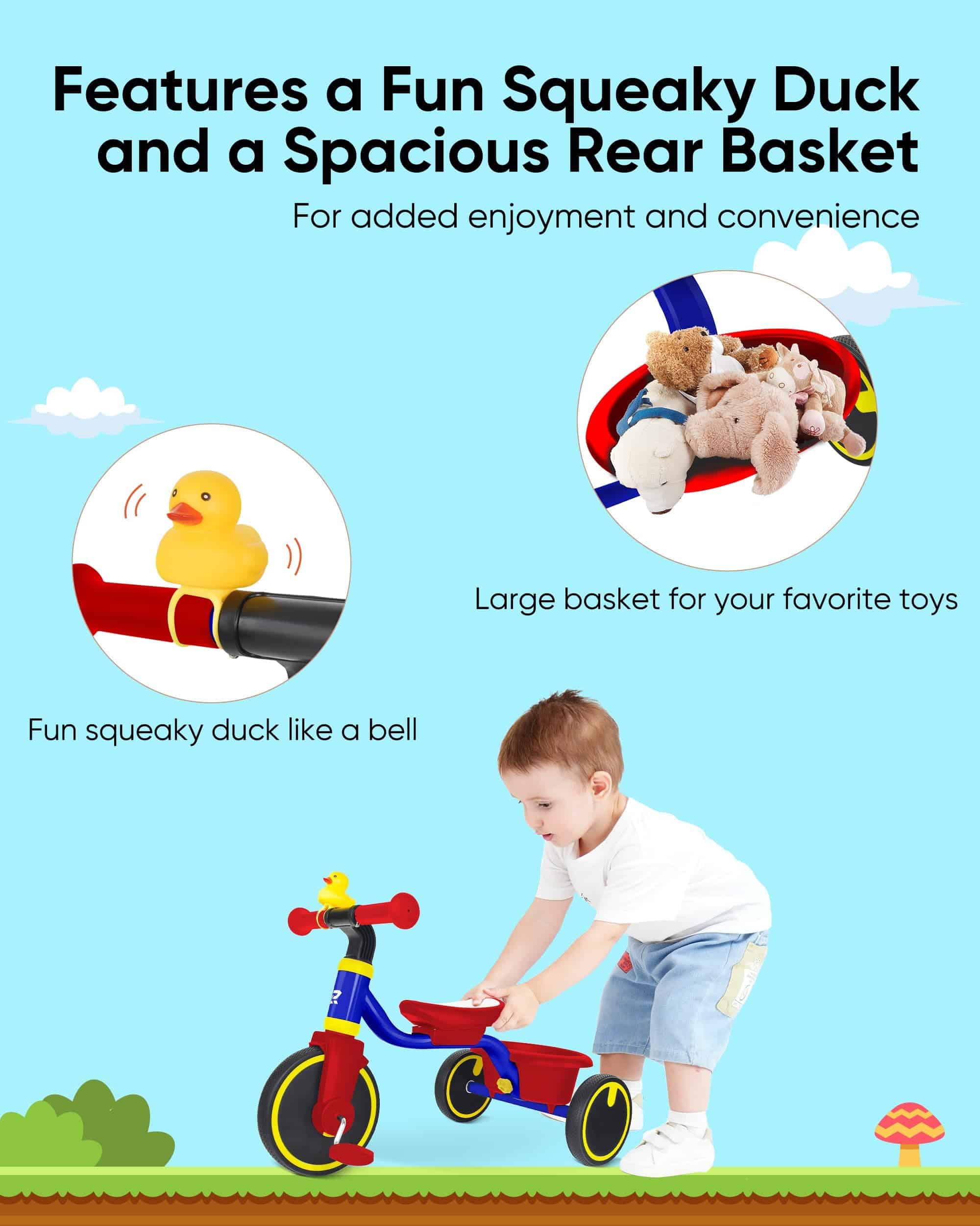 3. Características divertidas y funcionales: el triciclo para niños RIDYEE viene con un adorable pato chirriante que también funciona como campana, agregando emoción a cada paseo. Además, la cesta de gran capacidad es perfecta para almacenar todos los juguetes favoritos de tu hijo, haciendo que cada aventura sea más agradable y conveniente.