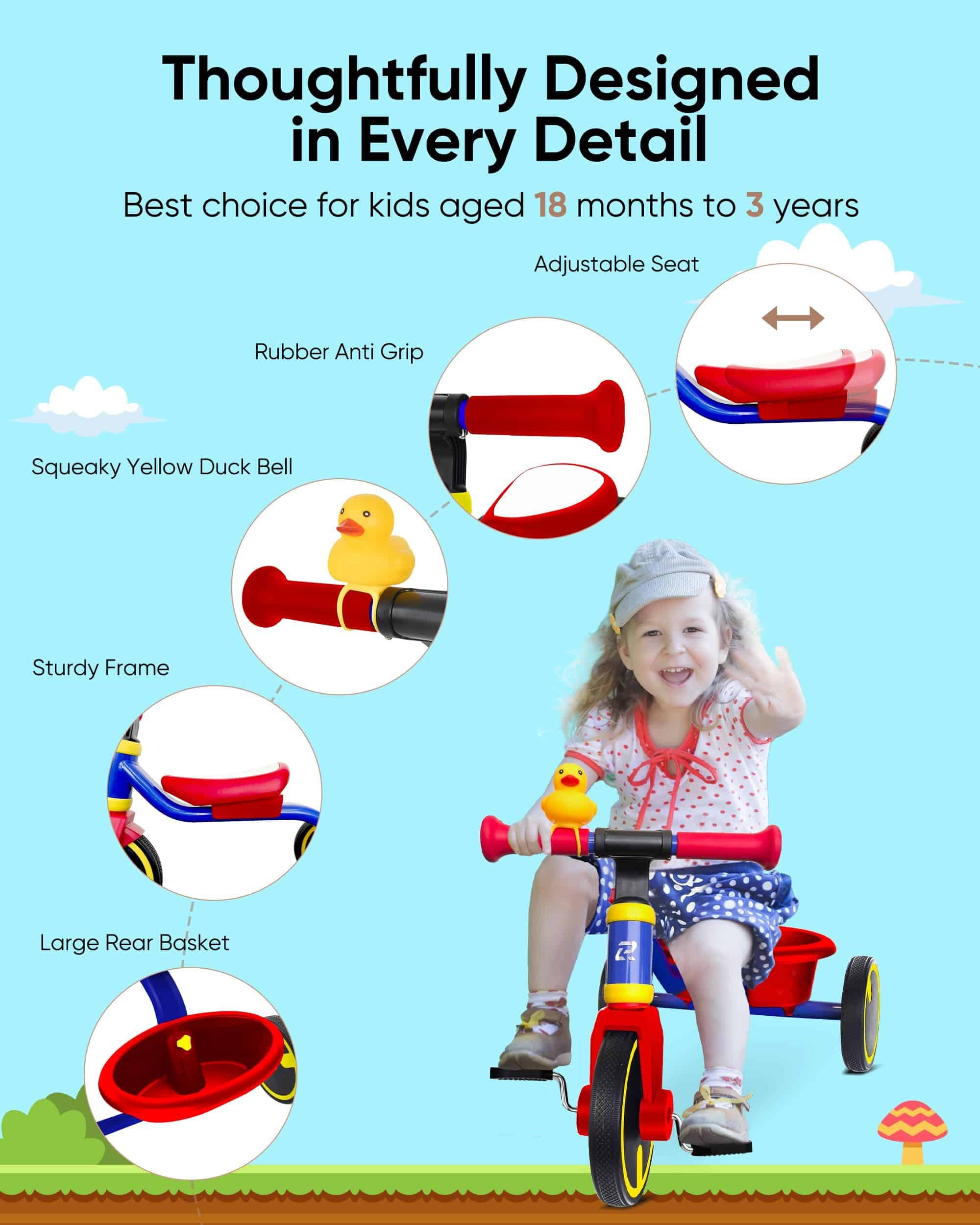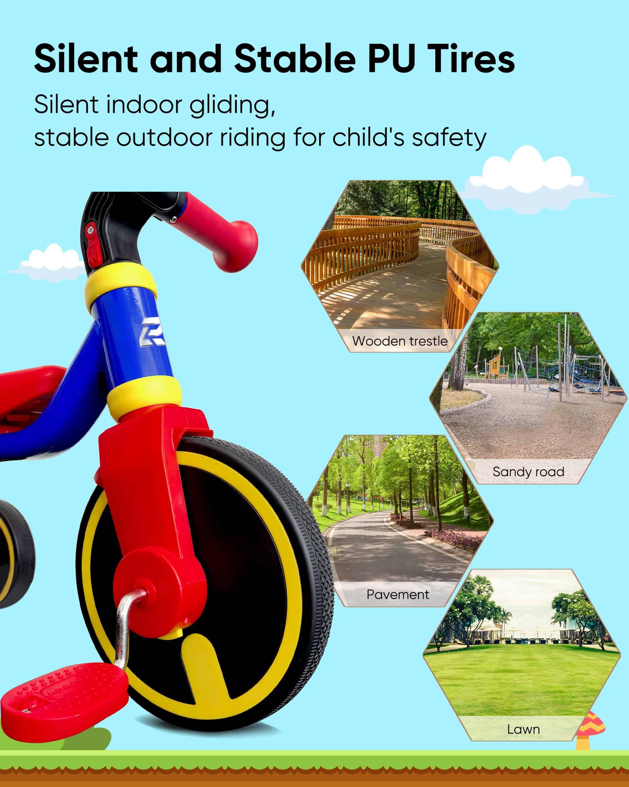 4. Estabilidad superior para paseos seguros: con un robusto marco triangular y ruedas traseras más anchas, este triciclo para niños de 1 a 3 años está diseñado para reducir el riesgo de vuelcos y mejorar la estabilidad, asegurando un paseo más seguro para tu hijo.