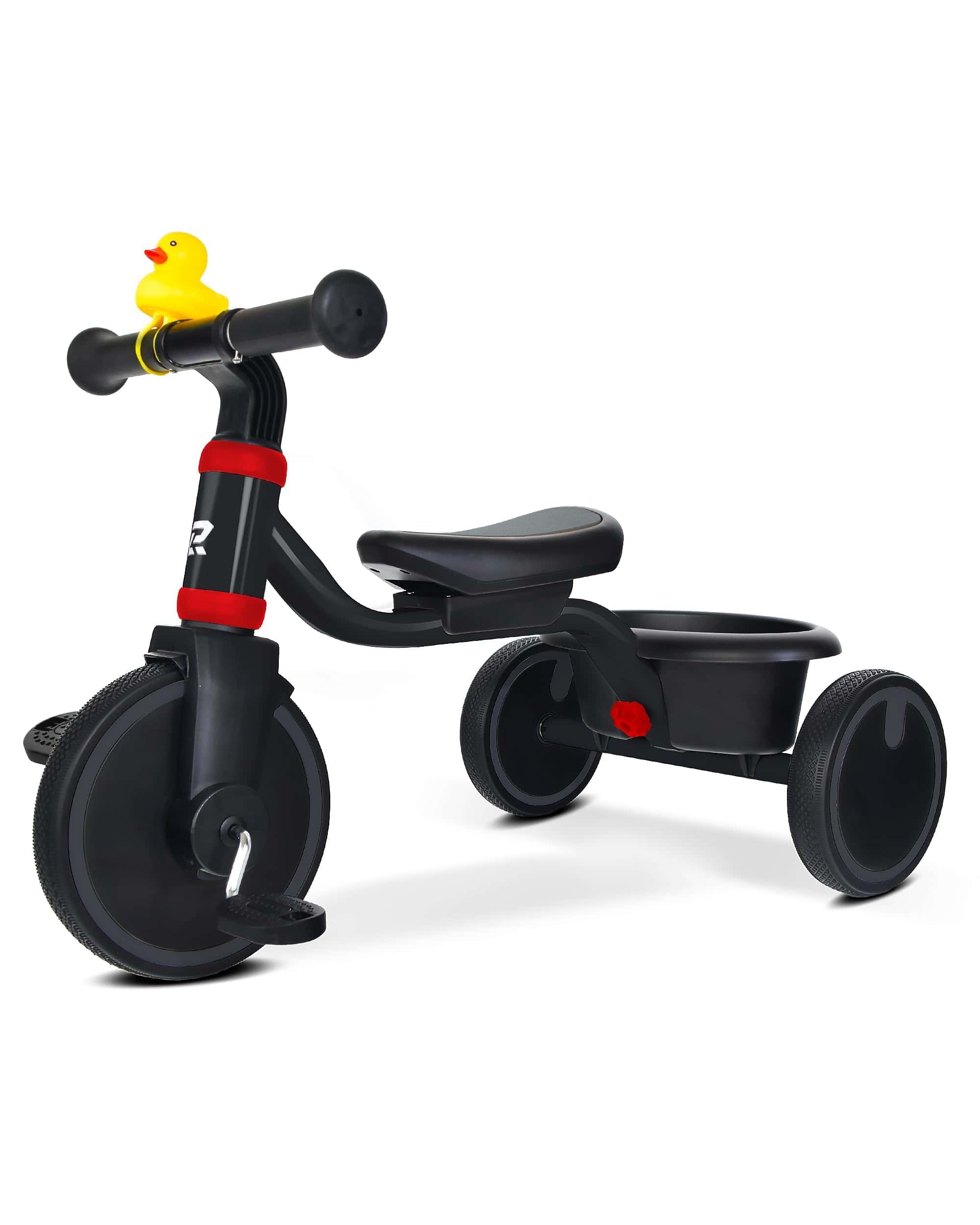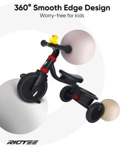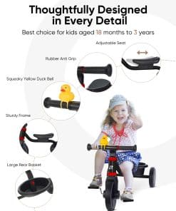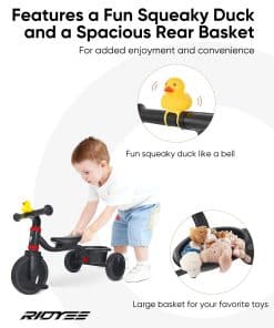 3. Características Divertidas y Funcionales – El triciclo RIDYEE para niños viene con un adorable pato chirriante que funciona como campana, añadiendo emoción a cada paseo. Además, la canasta de gran capacidad es perfecta para guardar todos los juguetes favoritos de tu hijo, haciendo que cada aventura sea más divertida y conveniente.