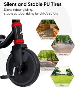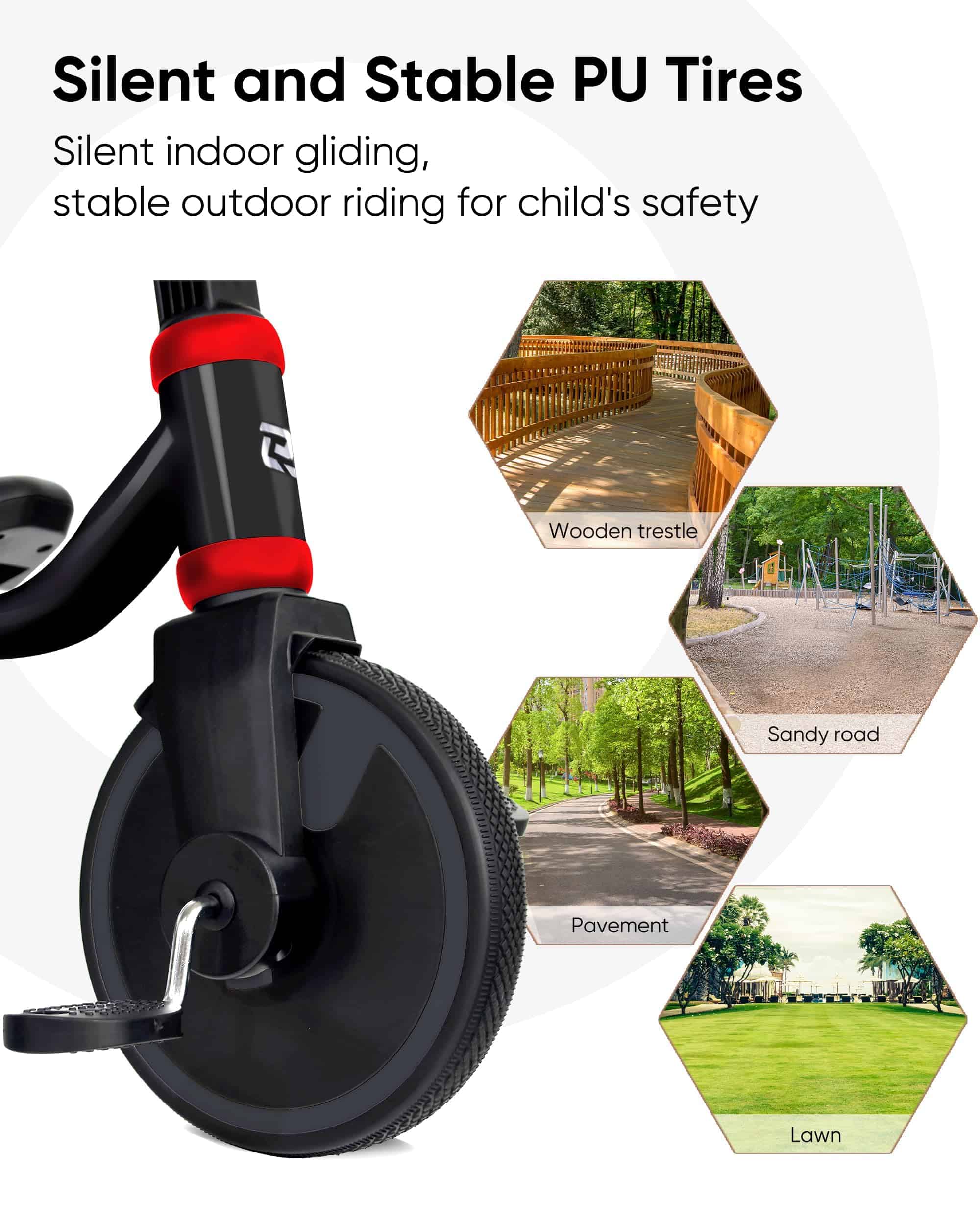 4. Estabilidad Superior para Paseos Seguros – Con un marco triangular robusto y ruedas traseras más anchas, este triciclo para niños de 1 a 3 años está diseñado para reducir el riesgo de vuelco y mejorar la estabilidad, garantizando un paseo más seguro para tu hijo.