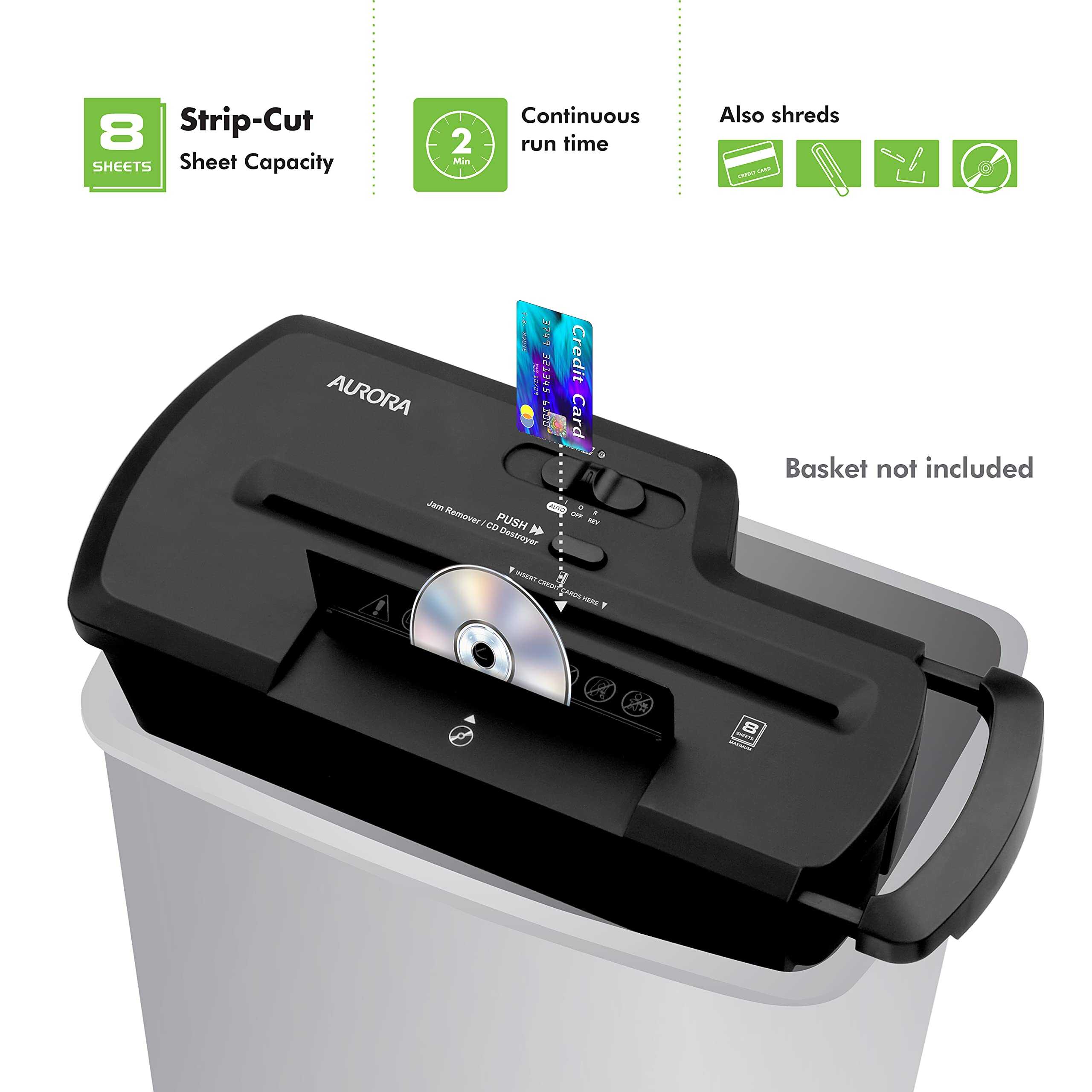 Diseñada para proporcionar seguridad económica de documentos, esta trituradora de papel es el dispositivo ideal para el hogar para ayudar a mantenerlo a salvo del robo de identidad. El AU800SZ acepta hasta ocho hojas de papel a la vez y las tritura en tiras de 1/4 de pulgada. El papel se tritura a una velocidad de 9.8 pies por minuto. Además del papel, el AU800SZ tritura CDs y tarjetas de crédito, evitando que la información vital caiga en manos equivocadas. La garganta de la trituradora tiene 8.7 pulgadas de ancho y el brazo extensible se adapta a la mayoría de los cestos de basura.