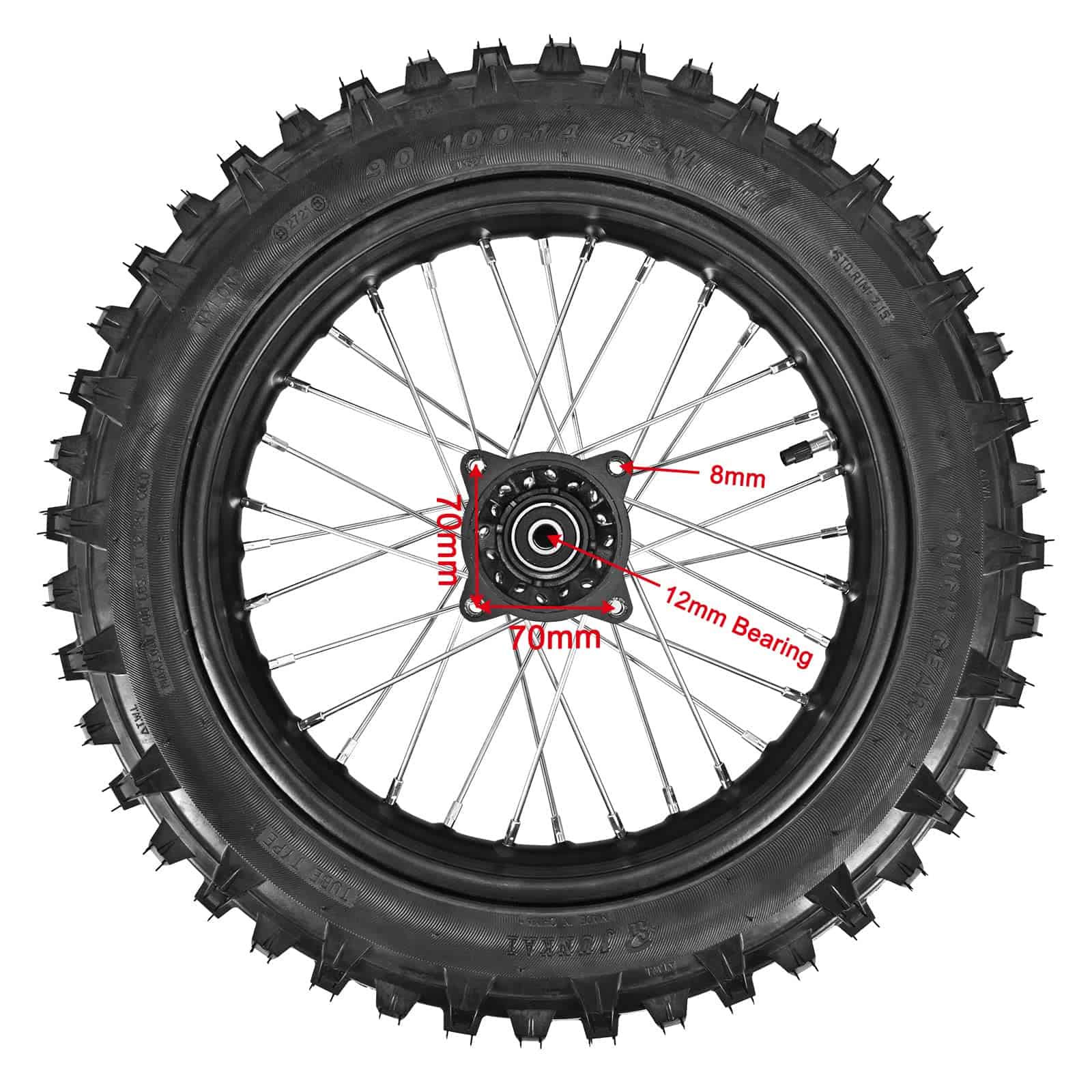 90/100-14, 14″ ensamblaje de rueda trasera para motocicletas todo terreno. El ensamblaje viene con el rin 1.85×14, neumático knobby 3.5-14, rodamiento de 12mm, tubo interior, rodamiento de rueda.