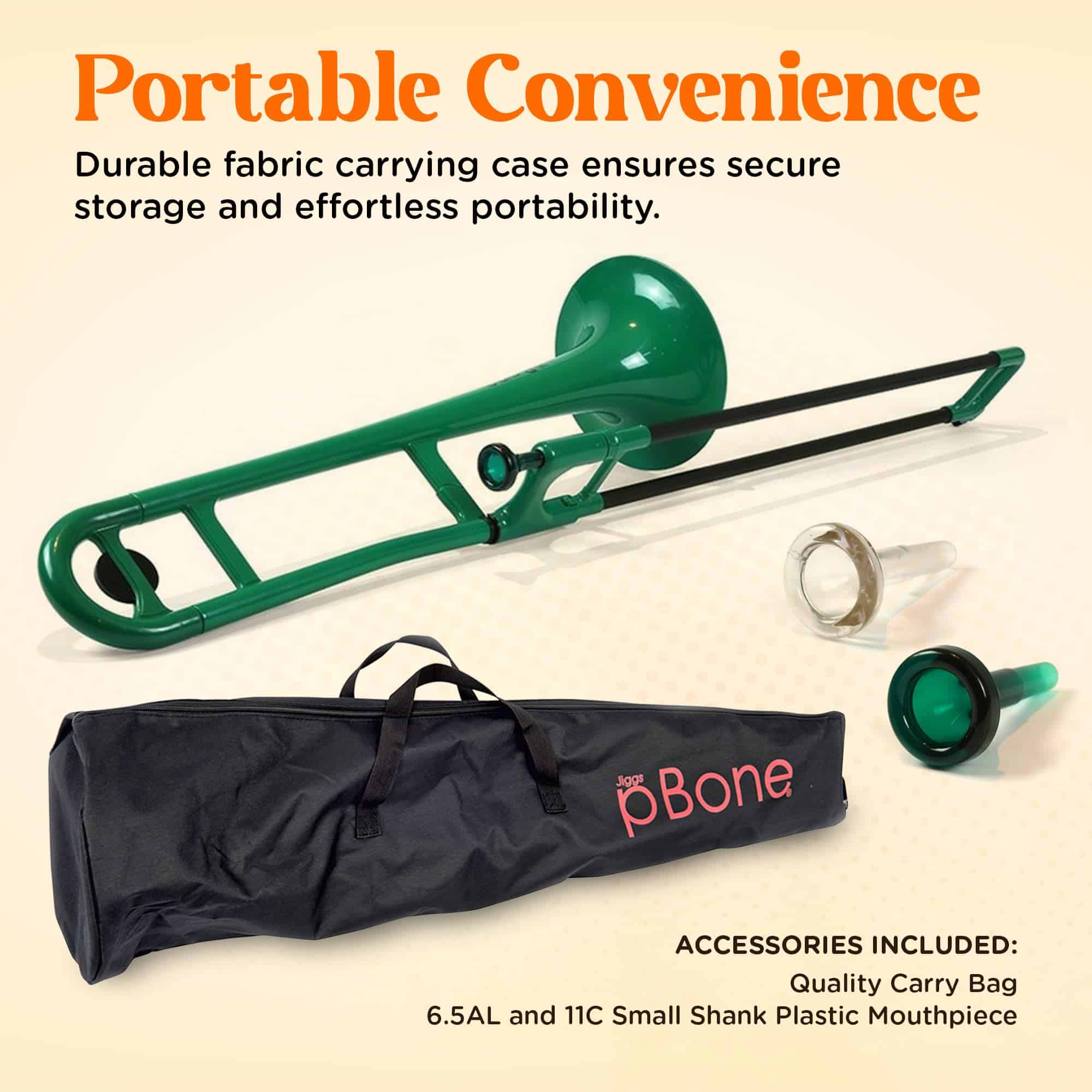 El Trombón pBone Jiggs Whigham aporta un giro divertido e intrigante al trombón tradicional. Con su construcción de plástico, este instrumento ligero suena notablemente como los trombones de latón típicos. El pBone presenta un diseño de diámetro de .500 pulgadas con un agarre ergonómico para mayor comodidad y un peso total de solo 1.8 libras. El pBone cuenta con un tubo de fibra de vidrio con casquillos de latón en el tubo deslizante interno para mantener el tubo deslizante moviéndose libremente. El tubo deslizante se sentirá más suave cuanto más toques el instrumento, e incluso puedes tocar el instrumento sin necesidad de lubricación del tubo. El pBone Jiggs incluye una boquilla de plástico y un estuche de transporte, y está disponible en varios colores.