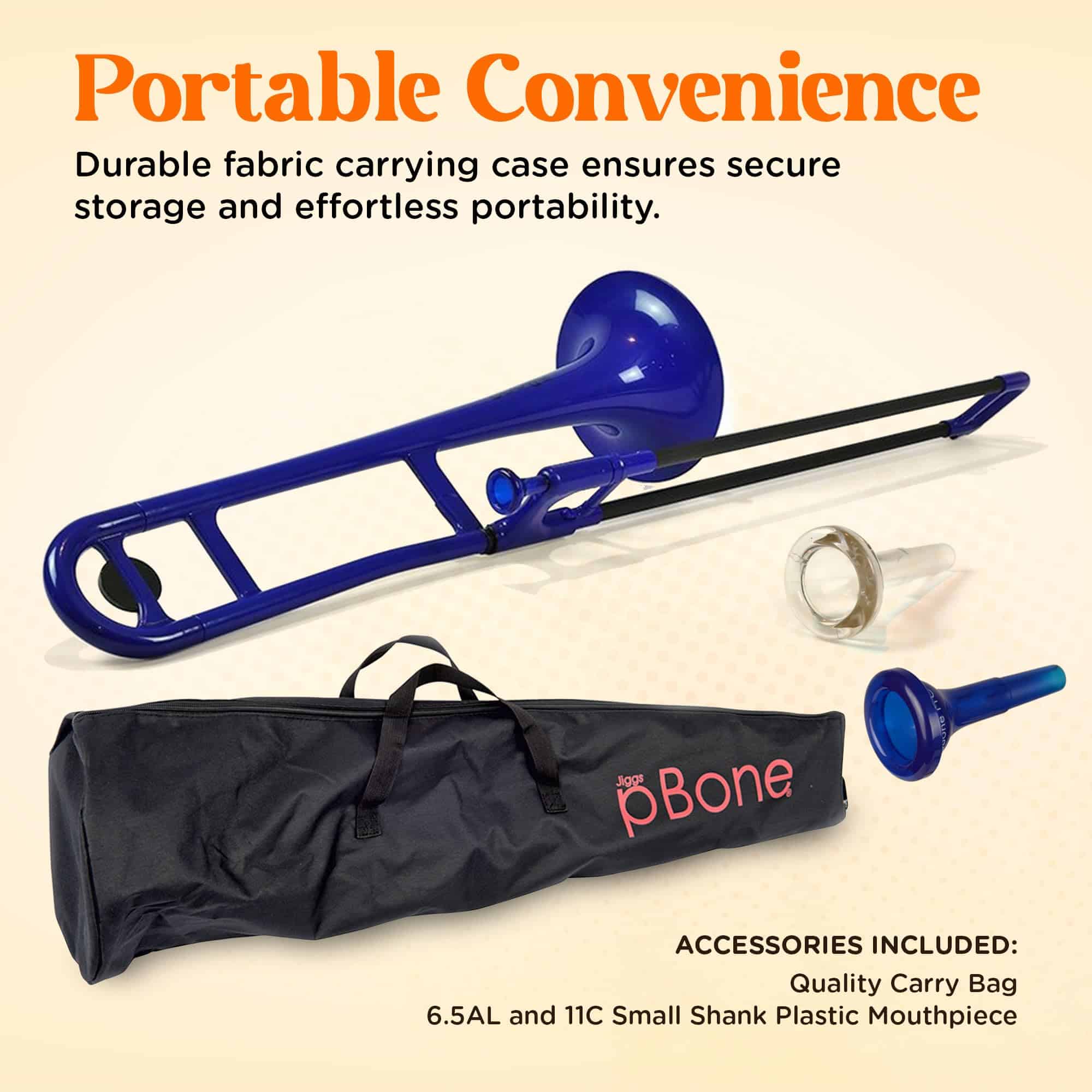 Además, el diseño único del pBone permite un montaje rápido y sin necesidad de mantenimiento. Viene con dos boquillas y un estuche de tela que facilita el almacenamiento seguro y el transporte a la escuela o a las lecciones.