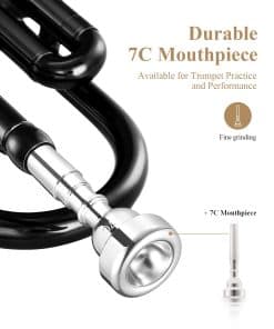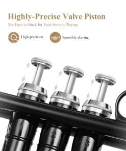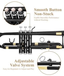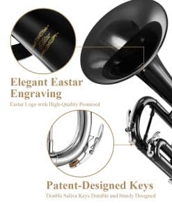 1. La trompeta es un instrumento musical que requiere limpieza y mantenimiento frecuentes. En caso de dificultad para tocar, asegúrese de desenroscar la tapa de las válvulas, para llevar a cabo la limpieza de las válvulas. 2. Los tubos internos no deben estar expuestos al vapor de agua durante mucho tiempo. Por lo tanto, mantenga los tubos internos cubiertos con aceite para válvulas todo el tiempo. Especificaciones 1. Color: Negro 2. Clave: Si Bb 3. Nivel: Instrumento de nivel principiante e intermedio 4. Material: Latón de cuproníquel 5. Peso del artículo: 6.6lb/3kg 6. Tamaño del paquete: 22.8(L) x 7.1(W)x 11.8(H) pulgadas /58(L) x 18(W)x 30(H) cm 7. Material del estuche rígido: Estuche con cubiertas de nailon resistente Incluido en el paquete: 1 x Trompeta Eastar ETR-380B 1 x Guantes Blancos 1 x Boquilla 7 C 1 x Aceite para Válvulas 1 x Kit de Limpieza de Trompeta 1 x Paño 1 x Estuche Rígido