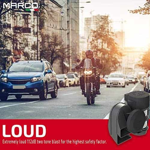Prioriza tu seguridad con un claxon para coche y motocicleta que los demás conductores no pueden ignorar. El claxon de aire Marco Tornado cuenta con tonos gemelos ultrapotentes que alertarán incluso a los conductores más distraídos para ayudarte a protegerte de colisiones en carretera. Nuestro claxon para coche tiene un diseño compacto que se adapta perfectamente a motocicletas, coches y vehículos más pequeños que necesitan hacerse oír en carreteras ruidosas. Con un compresor de aire integrado, este claxon eléctrico simplemente necesita ser conectado al sistema de 12V existente de tu vehículo. Una guía detallada de instalación está disponible en la caja. A diferencia de otros claxones de aire baratos para moto en el mercado, Marco Tornado se enorgullece de ofrecer un claxon de coche que está hecho para durar con componentes de calidad. Por eso ofrecemos una garantía limitada de 12 meses, dándote la tranquilidad de que estás comprando un claxon de auto súper fuerte que durará años. No confíes en que otros conductores te vean, toma tu seguridad en tus propias manos hoy con un claxon eléctrico que te hará notar.