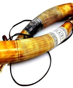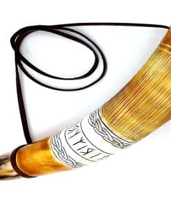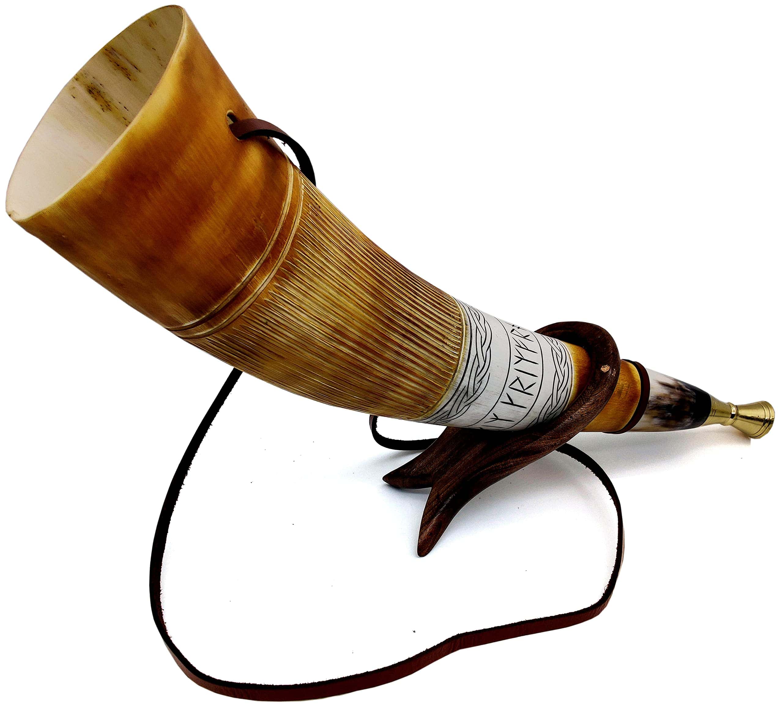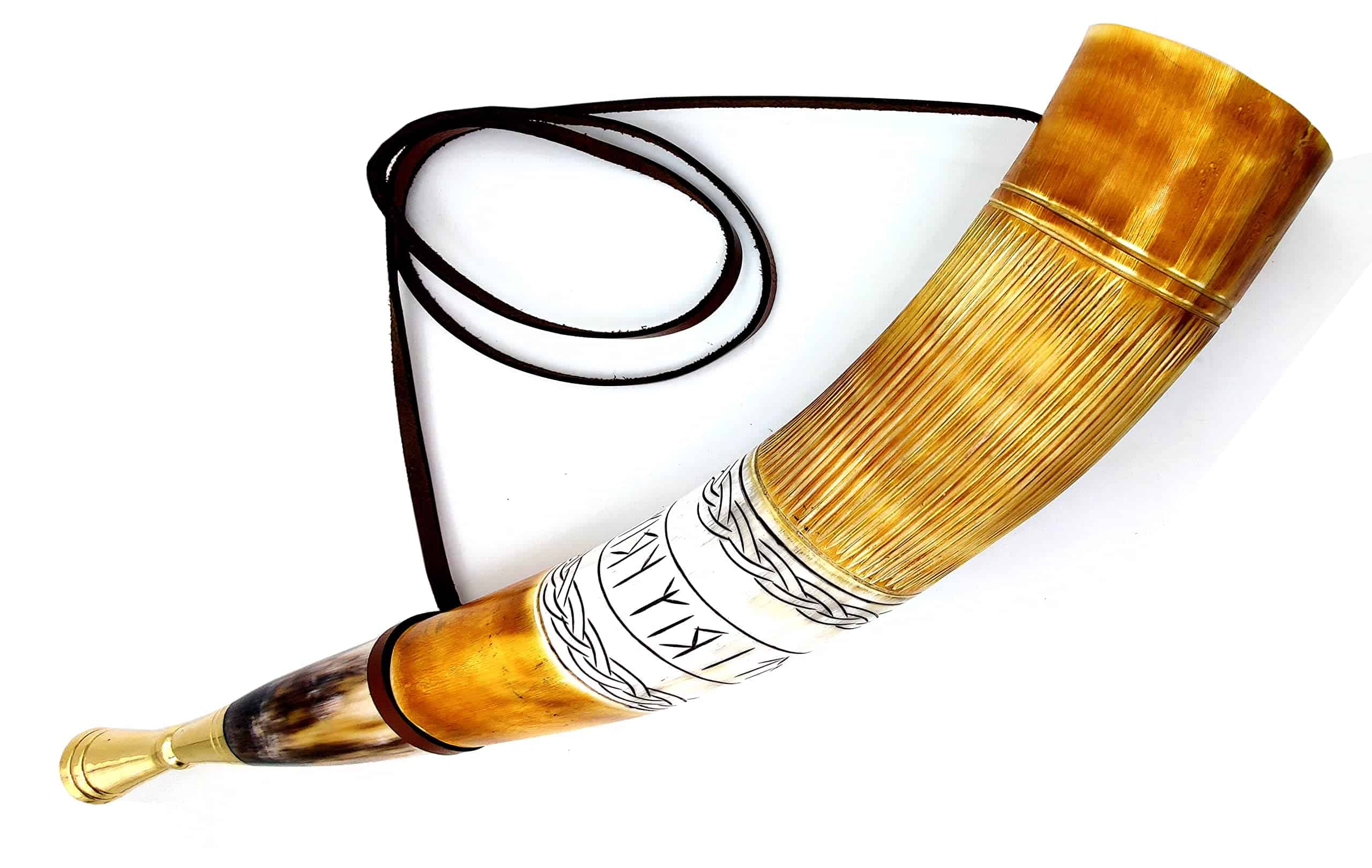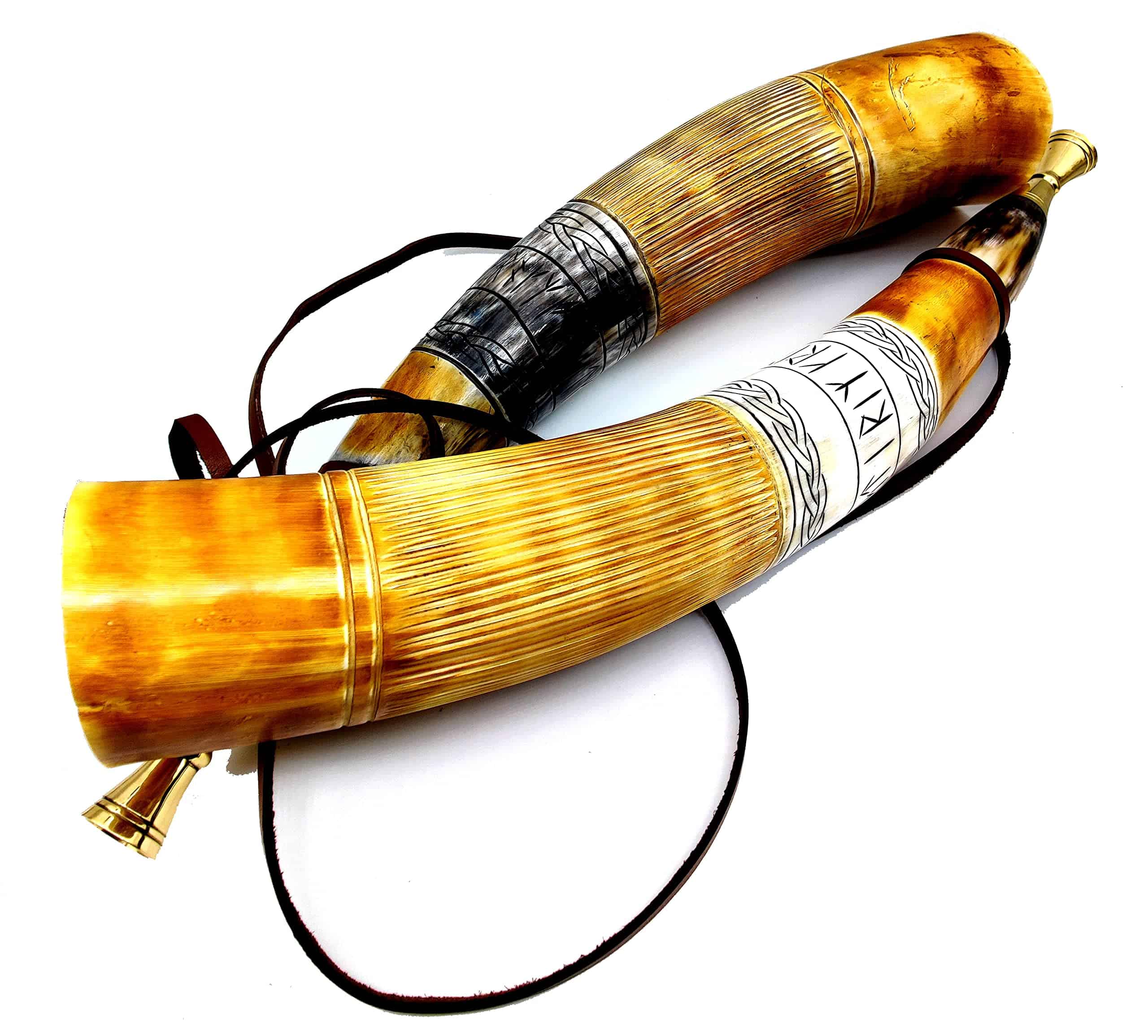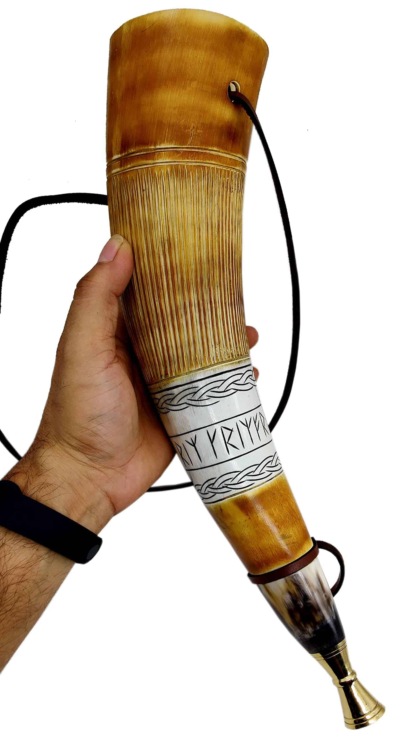 Cada cuerno se fabrica artesanalmente con cuerno de buey genuino y transporta a la antigüedad con su rico tono. No se utiliza boquilla para crear este efecto, simplemente ingeniería de sonido antigua. El cuerno de batalla está hecho a mano por hábiles artesanos que mantienen rigurosamente los estándares de calidad para garantizar la finest calidad. Cada cuerno viene con una correa de hombro de cuero genuino para mayor comodidad. El cuerno de soplar es único en forma, textura y color, ya que no hay dos cuernos iguales. Se aproxima a 15-16 pulgadas de longitud y su sonido agudo recuerda al de ciertos animales. Inspírate en la cultura vikinga y únete a una comunidad dedicada a los valores antiguos. Los cuernos de soplado se utilizaban para comunicarse y advertir en tiempos Vikingos y Medievales. Cada cuerno es una obra de arte única tallada con runas futhark más jóvenes que transmiten la valentía y la fuerza de los Vikingos. Disfruta de un cuerno de soplar hecho a mano con autenticidad y estilo medieval, diseñado con un efecto quemado para realzar su belleza única.