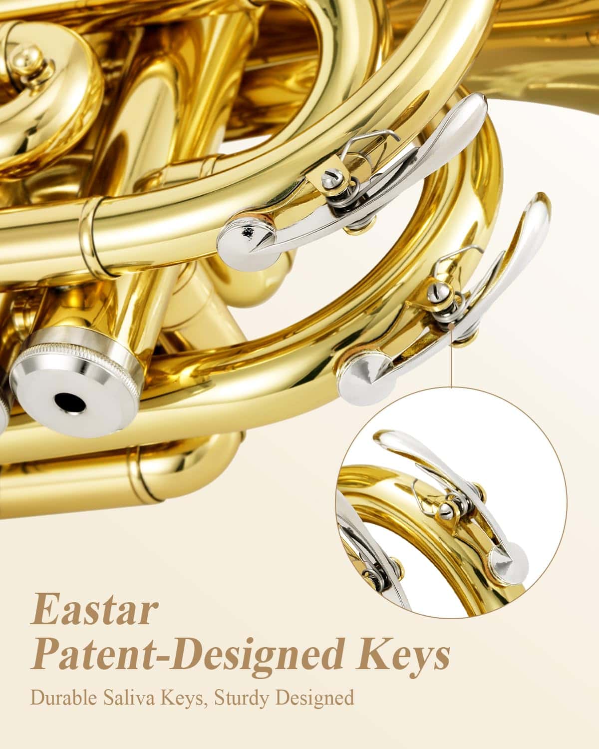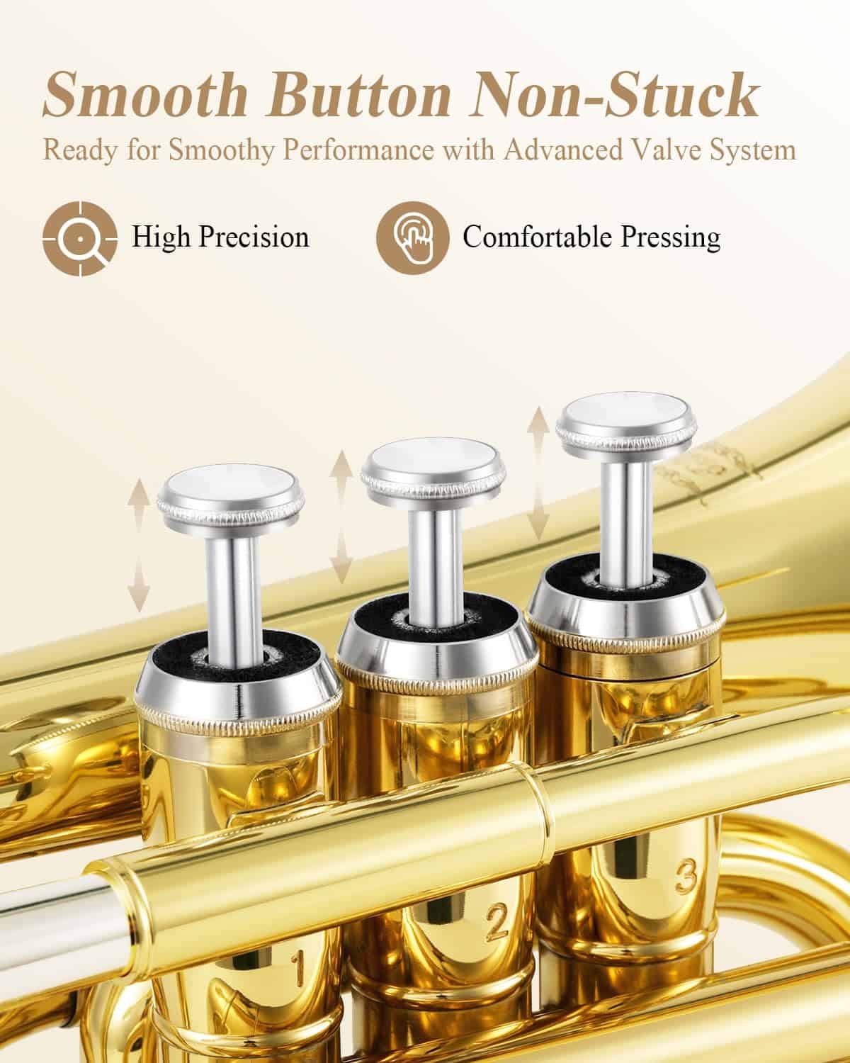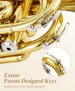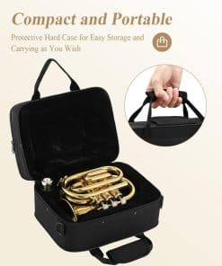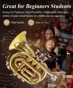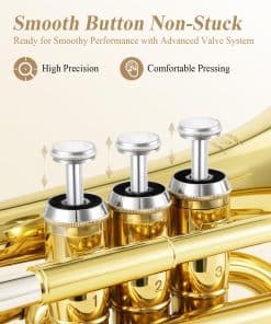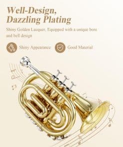 1. AMAZING TIMBRE El sonido y timbre de la trompeta de bolsillo Bb de Eastar son puros y brillantes, abundantes y potentes, con una excelente vibración. También es un instrumento de viento-metal fácil de usar para principiantes y estudiantes. 2. BEAUTIFUL APPEARANCE Aplicando un recubrimiento de laca de aspecto agradable, color deslumbrante y brillante, y una reflexión excelente, esta trompeta de bolsillo puede ser una buena opción como regalo para aquellos a quienes te importa y amas. 3. RELIABLE DESIGN Equipado con un exclusivo diámetro aproximado de 11.6mm/0.457» y campana de 101mm/3.98», el sistema de válvulas de la trompeta es altamente duradero durante la ejecución sin preocuparse por atascarse. 4. GREAT FOR BEGINNERS Hecho de latón y cuproníquel de alta calidad en los que puedes confiar. Las válvulas enlazan cada tubo de manera precisa para proporcionar una estanqueidad fuerte y una alta capacidad de juego. Botones de nácar falso blanco incrustados para una mejor experiencia de juego. 5. COMES WITH EVERYTHING NEEDED El paquete incluye la Trompeta de Bolsillo Dorada Eastar ETR-330, guantes blancos, paño, kit de limpieza, boquilla 7C y estuche rígido. Garantía de producto de 12 meses respaldada por nuestro increíble equipo de soporte al cliente listo para ayudar.