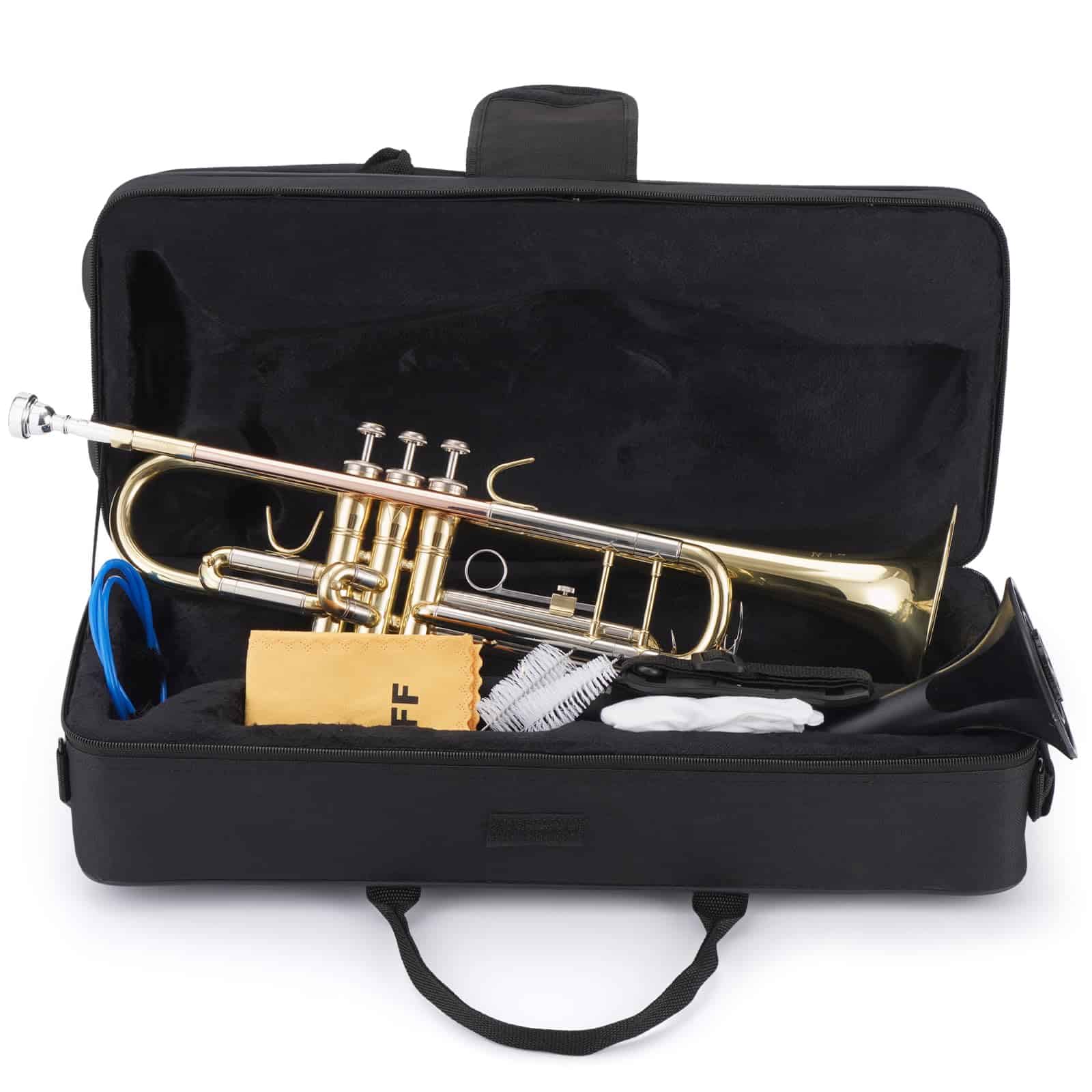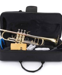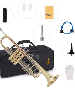 1. Gran trompeta para principiantes – La trompeta Bb tiene un tono y sonido puro, brillante, rico y potente con una excelente vibración. Este es un instrumento de viento metal fácil de usar para principiantes y estudiantes. 2. Hermoso y genial – Nuestro set de trompeta está hecho de material de latón de alta calidad, tubo de boquilla de bronce fosforado, altamente pulido, con un color deslumbrante y brillante y detalles exquisitos, una buena elección para regalo. 3. Gran sonido – Con diseño de cuerpo integrado, las válvulas están conectadas de manera precisa a cada cuerpo, hermético y altamente sopable. Puede tocar un sonido de trompeta fuerte y claro, así como una melodía hermosa y cantable. 4. Fácil de tocar – Los resortes de la trompeta están hechos de acero tratado térmicamente y vuelven rápidamente para soportar tu interpretación sin preocuparte por atascos. El reposabocas de la corredera de la 1ra válvula y el bloqueo ajustable de la 3ra corredera proporcionan un sonido amplio con una respuesta rápida y un gran feedback para el trompetista. 5. Totalmente equipado – Nuestra trompeta para principiantes incluye 1 trompeta, 1 estuche rígido duradero con correa ajustable, 1 boquilla 7C, 1 paño de pulido y un par de guantes blancos.