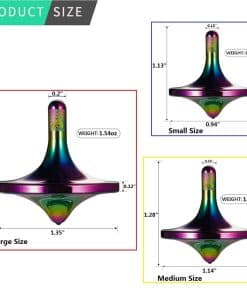 Acerca de Nosotros: Nos concentramos principalmente en el diseño, fabricación y venta de juguetes de física. Esperamos que nuestros productos puedan brindarte un placer interminable. Mejor Regalo: El trompo es un regalo muy significativo, recuerdos de la infancia, amistad preciosa, puedes enviarlo como un regalo a tus amigos o familiares y así sucesivamente. Duradero: El rodamiento de nitruro de silicio en todos nuestros trompos de girar ofrece una resistencia superior al desgaste. bien hecho, sin arañazos, sin signos de la máquina, perfectamente equilibrado. Cuerpo Superior del Trompo Estriado: El estriado en el vástago permite el desarrollo de un arranque de alto par para desarrollar altas RPM al lanzar, al mismo tiempo, más fácil de girar. Girar por Mucho Tiempo: Después de practicar, un adulto experto podría girarlo durante 3-8 minutos fácilmente. Un regalo perfecto para cada amante del trompo. Alto Rendimiento: este es un trompo de aspecto extraordinario, de alto rendimiento. Se lanza fácilmente, se asienta rápidamente y gira suavemente. Alta Calidad: Inspeccionamos y probamos cuidadosamente cada trompo (y se introdujo también una prueba de violencia) para asegurar que tengas una buena experiencia de compra. Tamaño Mediano: La dificultad, el tiempo de giro y el rendimiento de equilibrio del tamaño mediano están entre el del tamaño grande y el tamaño pequeño. Por favor, elige el tamaño apropiado según tus necesidades y tecnología de rotación. Dimensiones Totales: Tamaño Grande: 1.34 pulgadas x 1.36 pulgadas (diámetro x alto); Tamaño Mediano: 1.14 pulgadas x1.28 pulgadas (diámetro x alto); Tamaño Pequeño: 0.94 pulgadas x 1.13 pulgadas (diámetro x alto) Peso Neto: Tamaño Grande: 1.63 oz; Tamaño Mediano: 1.02 oz; Tamaño Pequeño: 0.66 oz Material: acero inoxidable 304, bolas de cerámica de nitruro de silicio Lista de Empaque: Trompo grande x1, trompo mediano x1, trompo pequeño x1