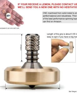 TODO SPINNING TOPS DE NUESTRA RECOPILACIÓN COMPARTEN UNA MISMA CAJA EXTERIOR, ¡NECESITAS ABRIR LA CAJA PARA VER QUÉ ES! Long Spinning Time: A skilled adult could easily spin it for 5-8 minutes on a concave glass; if you are good at spinning then 10 minutes is possible. Precision Craftsmanship And Fine Material: CNC machined from solid metal to ensure perfect balance and robustness: Titanium stem circled by a Brass collar; Silicon Nitride Ceramic tip provides exceptional wear resistance for long term use; knurled upper top body for better grip and faster spins; length of the grip is about 0.55″ so if you have a big hand it will be easy for you to spin. Looks beautifully even if just place at table. Simply a piece of art. Great Time Killer: My former colleague who’s in charge of this product line was fired because he spent too much time on spinning and timing. Whenever you feel boring (shopping with your wife or your mother, waiting at the airport, running for President of USA, etc.) or when you want to have a break at work, or when you have to test if you are still in your dream, this one is a good choice. Wonderful Gift To Those You Love: this tiny shiny top is easy to play, easy to carry (overall size is around 1″x1″x1″), hard to be broken (CNC machined from solid metal), and most importantly, it can be played almost anytime, anywhere; play it with your families to see who can spin it the longest is a good idea, kids will be excited (one of them will not soon since loser maybe will have to do housework, sad); it can also be used in pursuit of perfect Zen-like state (DON’T DO THIS AT WORK!). Great Desktop Toy To Add To Your Collection. DjuiinoStar stands behind its products, buy with confidence!