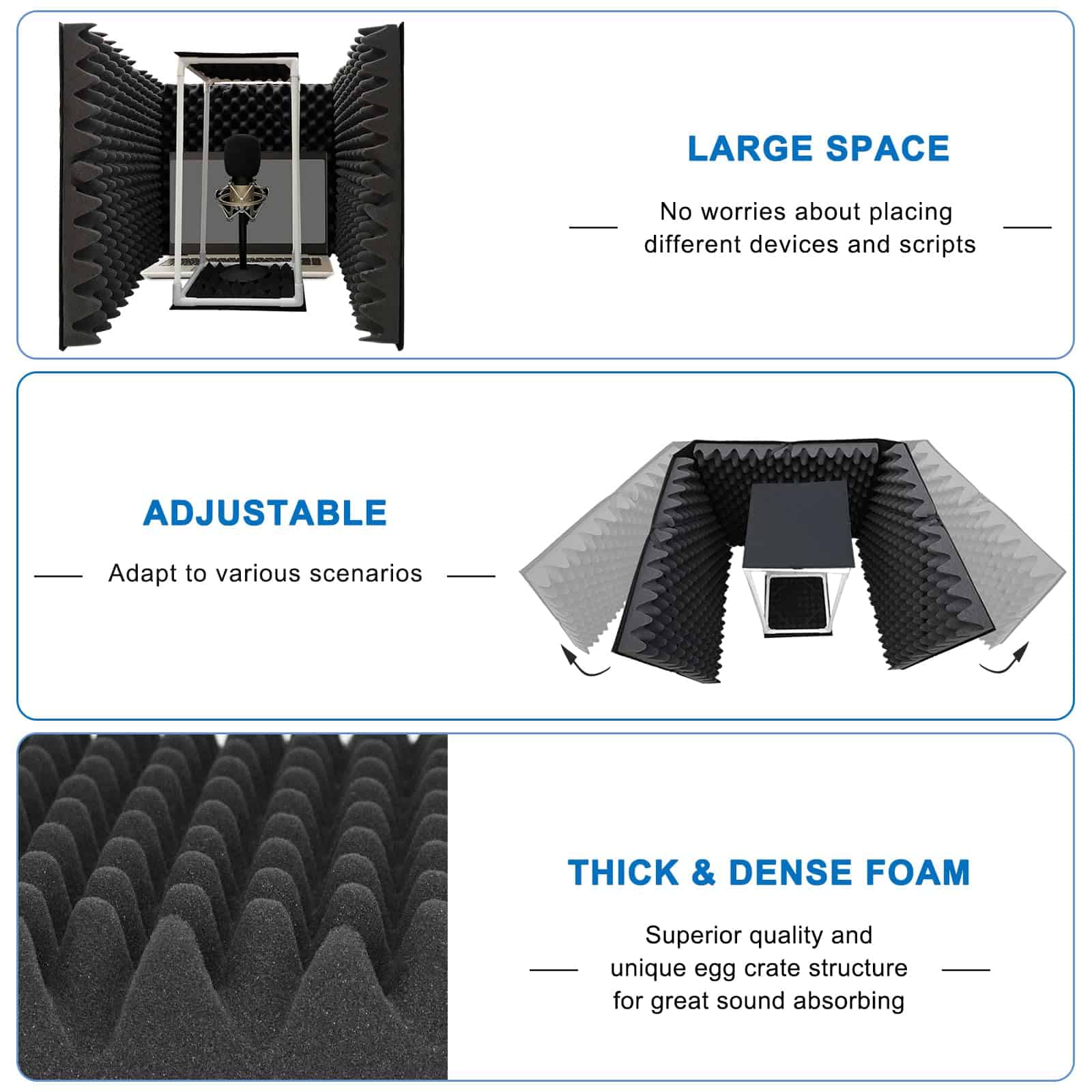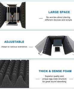 El Escudo de Aislamiento de Micrófono de TroyStudio está diseñado por ingenieros de grabación profesionales. Está especializado en asegurar que su grabación esté protegida de interferencias no deseadas de ambiente, como reverberación excesiva y rebote de eco. Un rendimiento acústico excepcional, un diseño listo para usar y un precio razonable hacen que sea el compañero ideal para grabaciones de música y vocales, sin importar dónde se encuentre. Cancelación de reverberaciones acústicas. La coloración de la habitación, como ondas estacionarias o reverberación no deseada, siempre es un desastre para la grabación de música o voces. Este escudo de aislamiento de micrófono puede resolver perfectamente este problema. Todas las superficies están cubiertas con espumas gruesas para absorber reflexiones de sonido y garantizar la sequedad de su grabación. ¡Cuando se trata de acústica, somos profesionales! En lugar de dejar a los clientes solos, realmente nos preocupamos por sus problemas. Los problemas acústicos suelen ser complicados, así que háblenos sobre su problema y le proporcionaremos una solución completa.