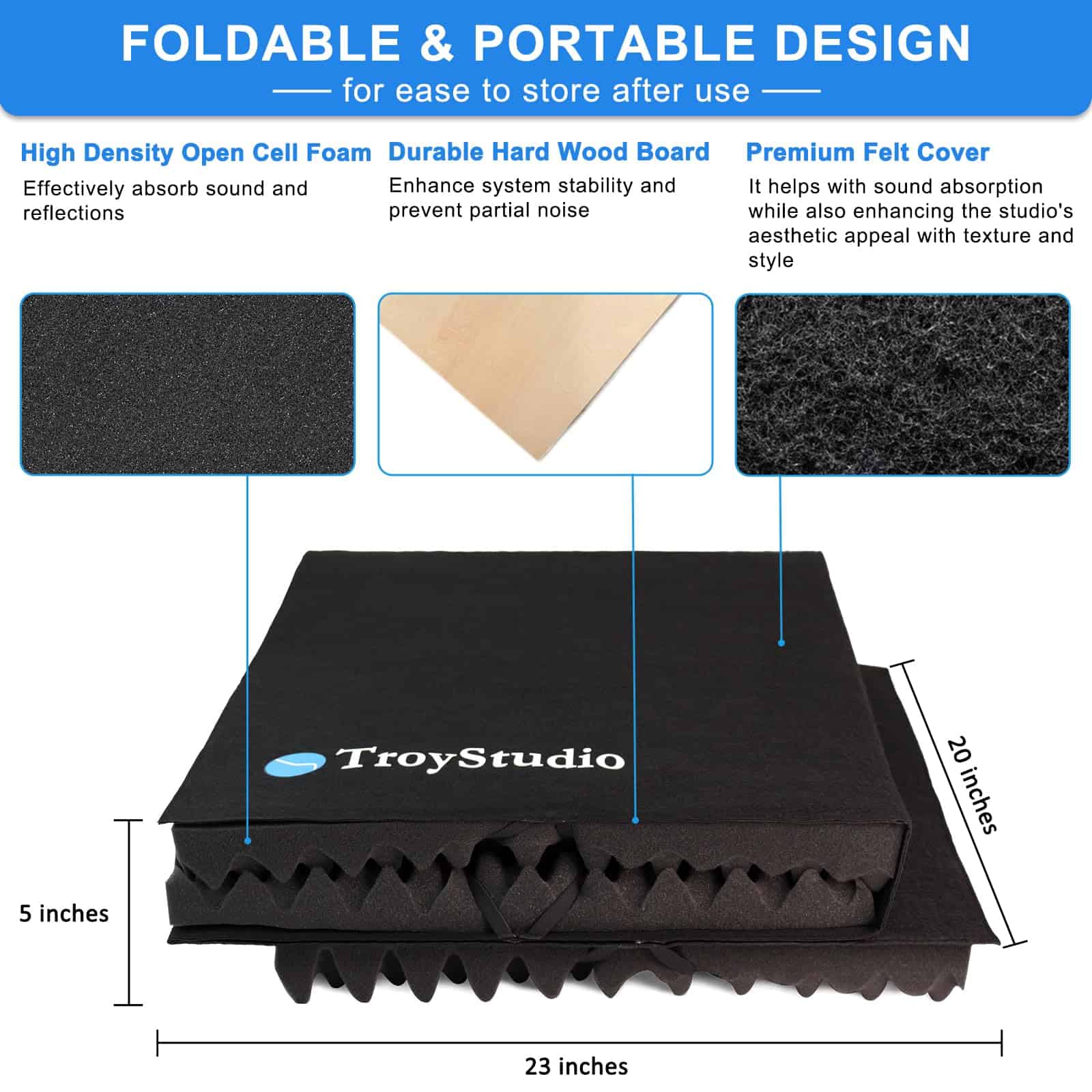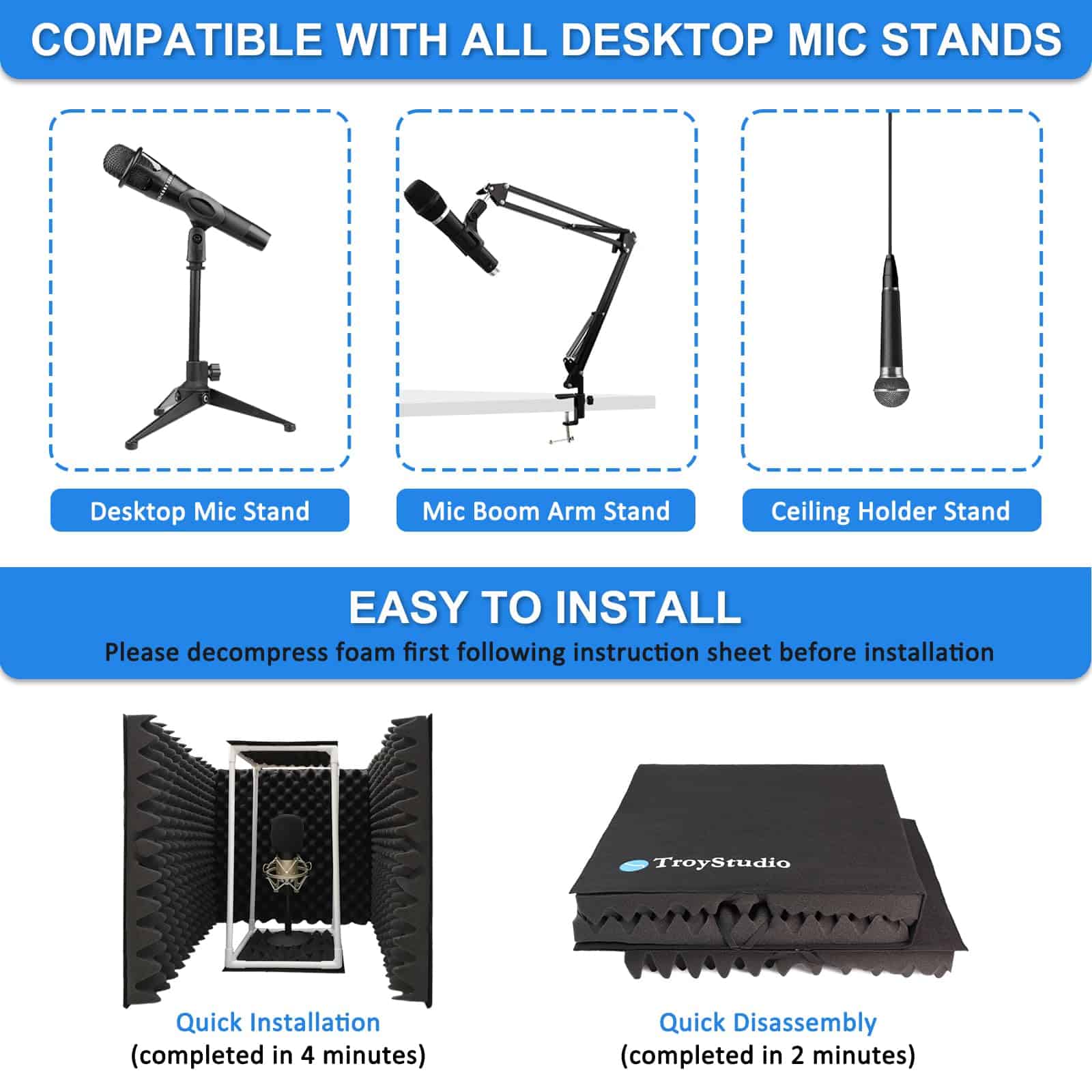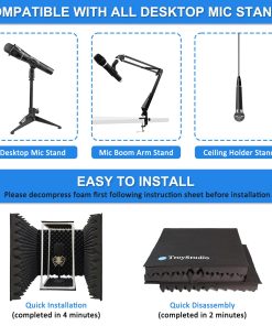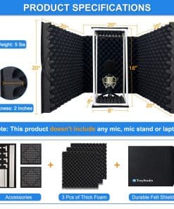 TroyStudio Micrófono escudo de aislamiento diseñado por ingenieros de grabación profesionales. Especializado en asegurar que su grabación esté protegida de interferencias no deseadas de ambiente, como reverberación excesiva y rebote de eco.