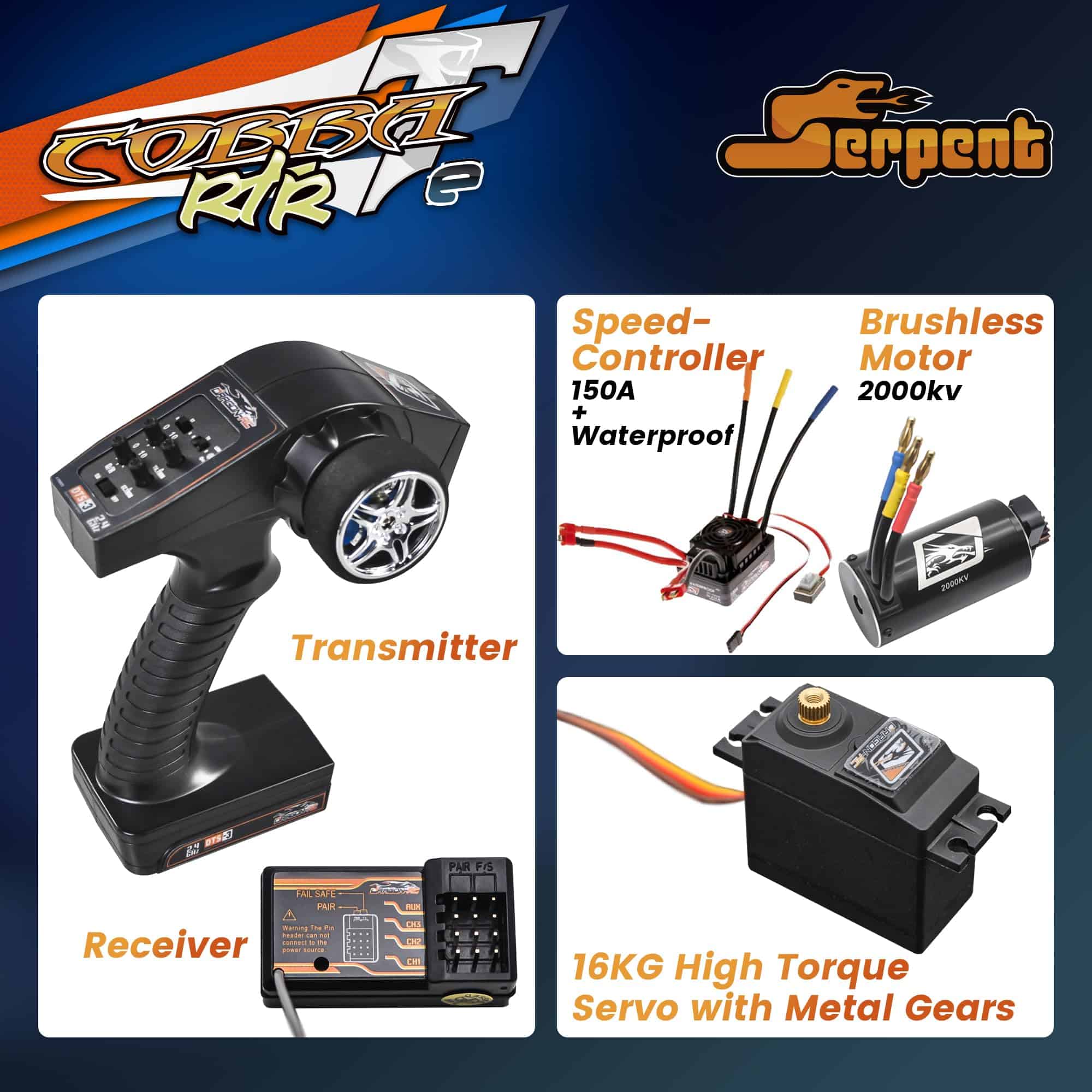 5. Paquete Integral: El paquete Cobra Truggy-e RTR incluye un chasis y electrónica completamente preensamblados por expertos, transmisor DragonRC 2.4 GHz, controlador de velocidad impermeable DragonRC, motor brushless longbody de 2000kV DragonRC y una carrocería de truggy prepintada de perfil bajo. Con el compromiso de Serpent con la calidad y el rendimiento, el Cobra Truggy-e RTR es un potente listo para correr que sobresale en la pista y fuera de ella.