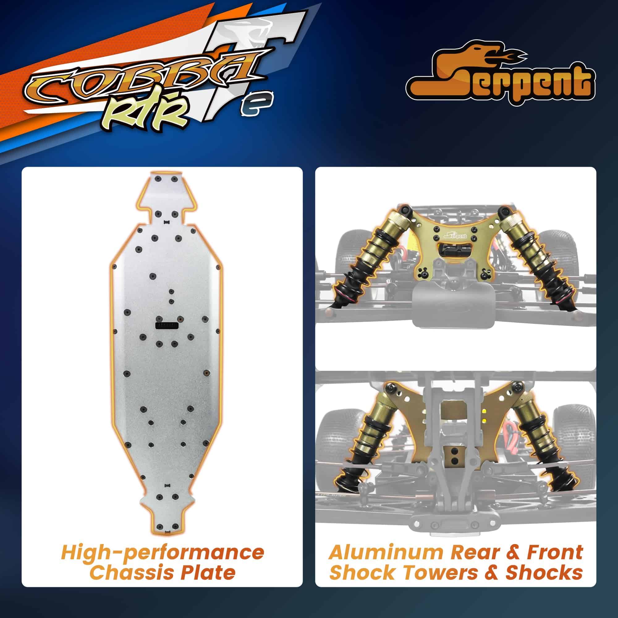 3. Diseño Listo para Carrera: El Cobra Truggy-e RTR incluye una carrocería de truggy prepintada de perfil bajo, un alerón trasero compuesto grande y neumáticos de truggy premontados para una acción inmediata. El estrecho chasis de aluminio 7075T6 de 3 mm con áreas mecanizadas para una flexión controlada, amortiguadores de gran diámetro, partes de transmisión de acero al resorte y escotillas garantizan un manejo y durabilidad óptimos.