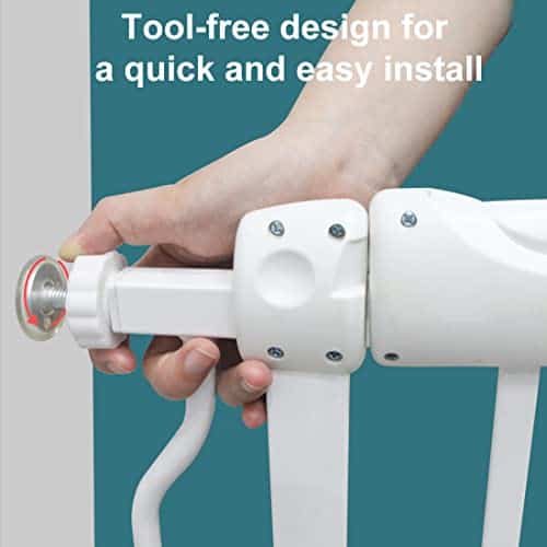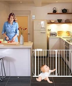5. PUERTA PARA PUERTA DE BEBÉ – Esta puerta está hecha de acero duradero que puede durar más que la madera. Y es a prueba de humedad. Tiene un seguro infantil perfecto para niños de 6 a 24 meses. Los niños y los perros son curiosos sobre el entorno, como el refrigerador, cajones, estanterías, escaleras, cocina, exterior, etc. Así que necesitas una puerta de bebé o para mascotas para mantenerlos alejados del peligro.
