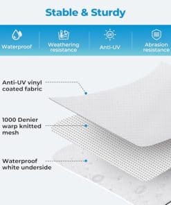 1. Materiales de Alta Calidad: La tela del toldo está hecha de vinilo resistente de 18.5oz, junto con una malla tejida de 1000 Denier. El vinilo no solo es grueso y resistente, sino que también tiene un revestimiento impermeable blanco en la parte inferior, proporcionando una protección dual contra la lluvia y el sol intenso. Esta tela te protege de los rayos UV intensos y la lluvia, asegurando que puedas disfrutar de tu espacio al aire libre en diversas condiciones climáticas.