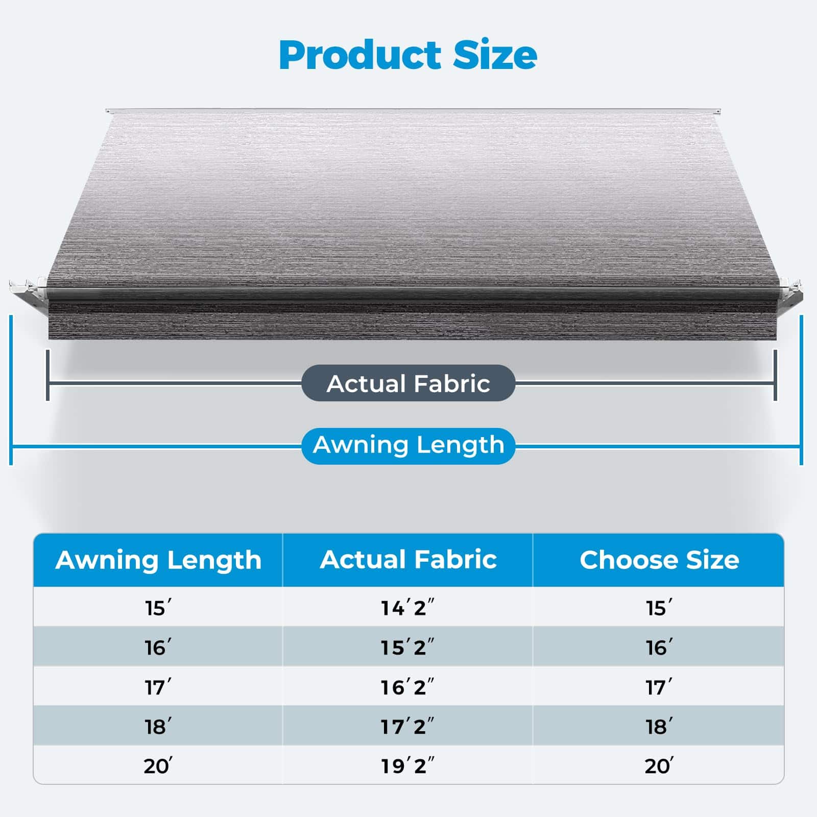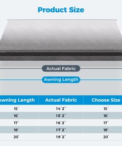 5. Presta Atención al Tamaño del Producto Antes de la Compra: Asegura un ajuste perfecto midiendo la distancia entre el centro de los brazos derecho e izquierdo de tu toldo. Para un toldo de 17′, selecciona el tamaño de 17′ (la tela mide 16’2″). El tamaño preciso es clave para un rendimiento y protección óptimos.