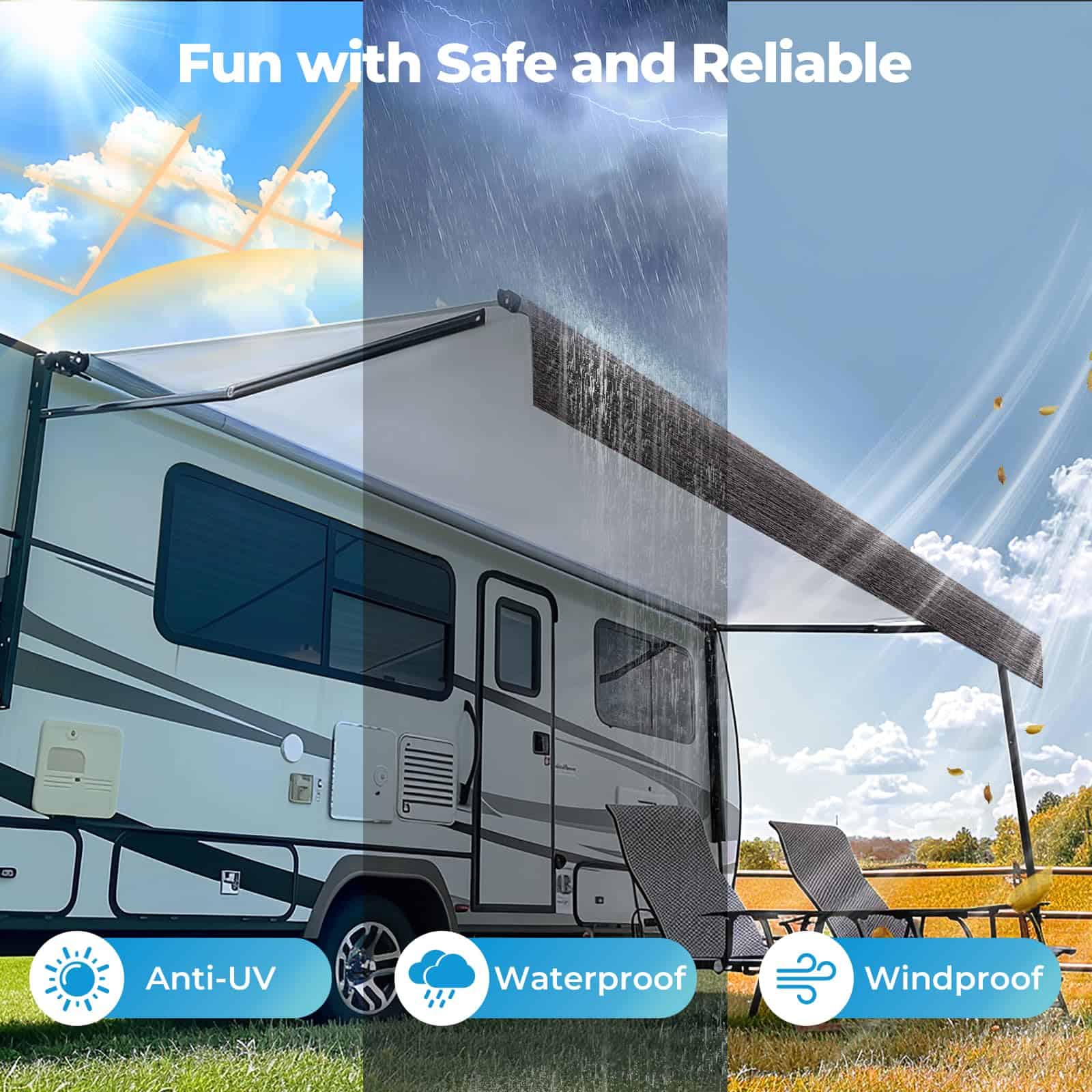 3. Gran Compatibilidad: La sustitución de tela para toldo incluye varillas de polietileno cosidas que se adaptan directamente a la mayoría de los tubos de enrollado de toldos existentes. Su compatibilidad con varios modelos de RV lo convierte en una solución flexible para muchos entusiastas del aire libre, ya sea que lo estés utilizando en un campista, autocaravana o RV.