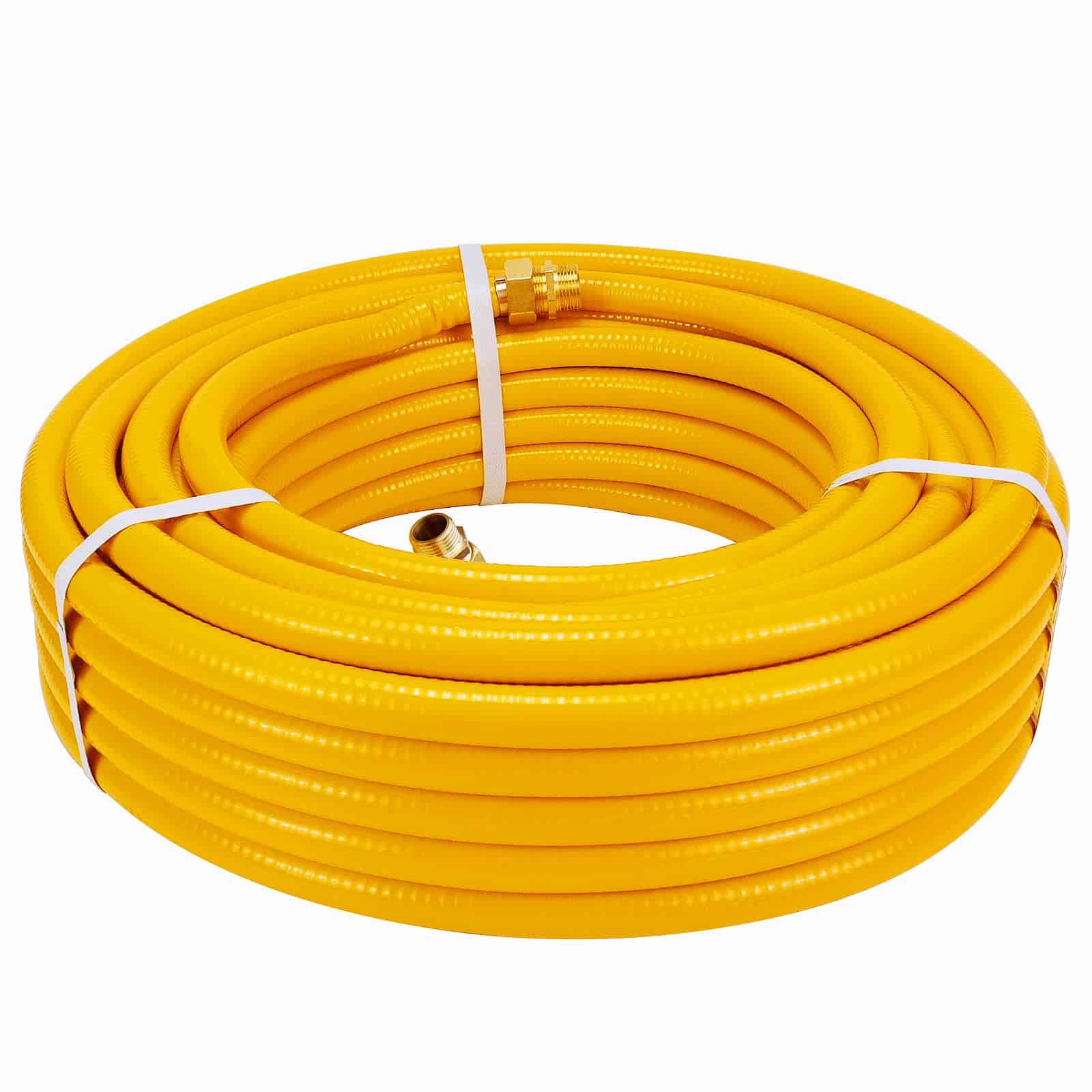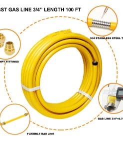 Tubo de Acero Inoxidable Corrugado para proporcionar hasta 150,000 BTU/hora de capacidad de flujo, ideal para conectar aplicaciones de gas natural o propano líquido en interiores y exteriores. La manguera de gas flexible está hecha de acero inoxidable SUS304 resistente a la corrosión, con una chaqueta de polietileno amarilla UV-resistente de 0.079 pulgadas. Viene con conexiones de latón macho de 3/4″ en ambos extremos para una fácil instalación. La flexibilidad y seguridad del tubo permiten cortarlo a la longitud deseada y evitar fugas de gas. Resistente a altas temperaturas y baja presión, se puede instalar expuesto a la luz, empotrado en concreto o detrás de la pared. Perfecto para instalaciones enterradas sin necesidad de juntas adicionales. Si necesita un reemplazo de accesorio conector, contáctenos para solicitarlo.