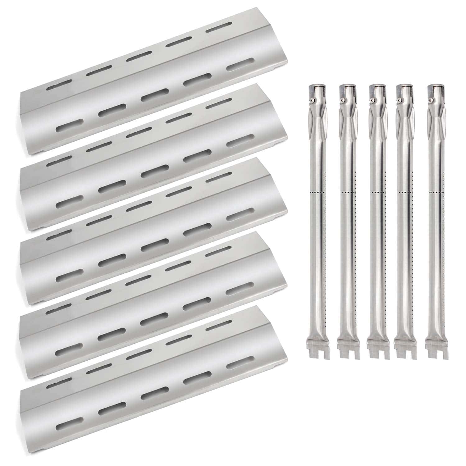 Kit de tubos de quemador y placas de calor de repuesto para parrillas Ducane de 5 quemadores. Fabricado con acero inoxidable de alta calidad para garantizar un uso duradero, distribución uniforme del calor y resistencia a deformaciones. Las placas de calor sirven para atrapar gotas de grasa y proteger los quemadores. Ideal para modelos Ducane 5 Burner 30400042, 30400043, 30400044, 30400045, 30558501, 30557401, 30457501, 30557501, 30458501, 30557801, 30500701, 30500097, 30558401, así como para modelos Home Depot 5 Burner 30400042 y 30400043. Antes de ordenar, asegúrate de medir el tamaño de tus piezas originales y compararlo con el nuestro.