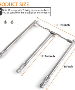 El paquete incluye tanto los quemadores izquierdo y derecho de 18 pulgadas, como el quemador central de 17-3/4 pulgadas, además de un cruce de 15-1/4 pulgadas de largo. Para mayor comodidad, vienen con tornillos de fijación que facilitan la instalación.
