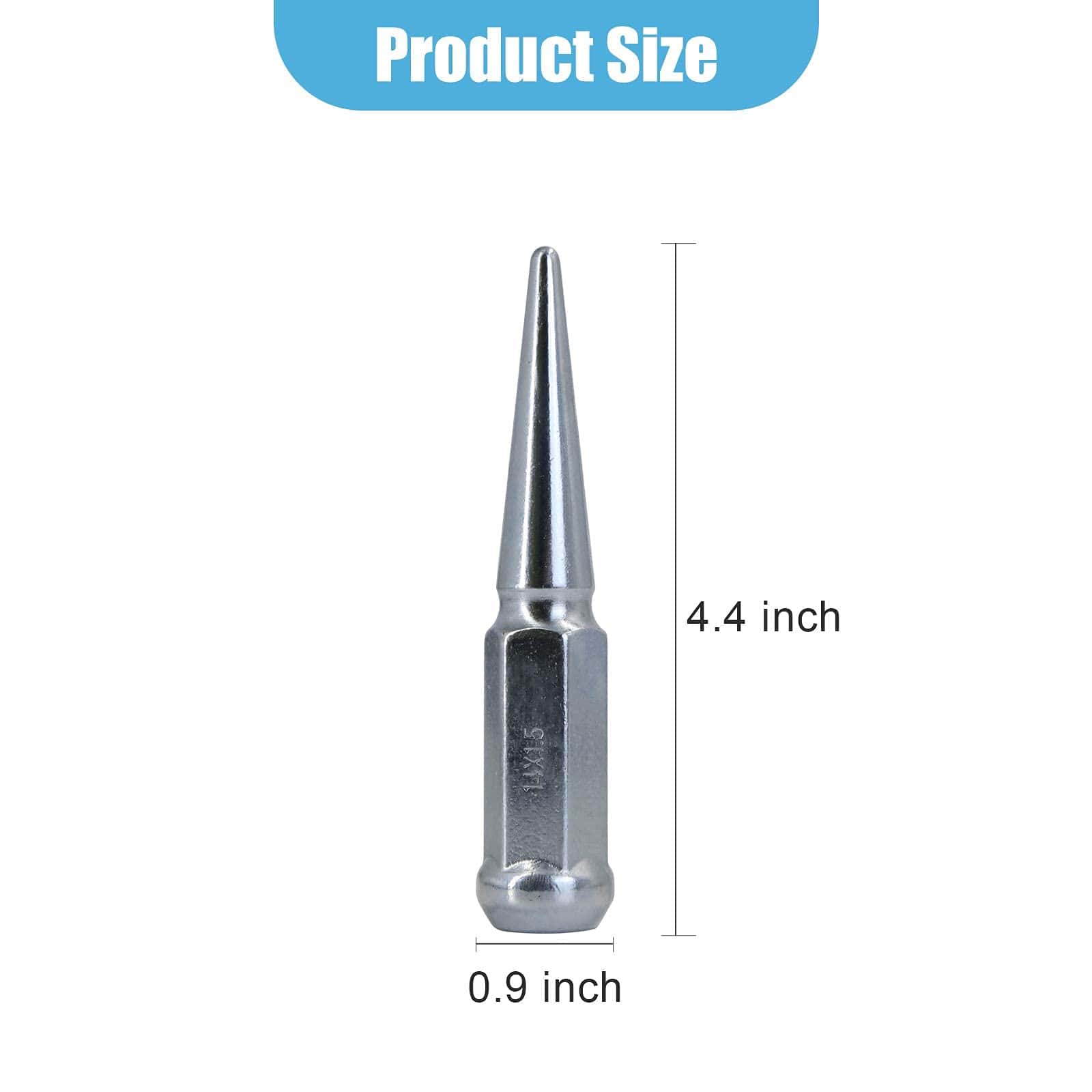 Especificaciones Rosca M14x1.5, Altura total 4.4 pulgadas, Diámetro 0.9 pulgadas, Espigada, Bulge Acorn, Cerrada, Asiento de cono de 60 grados
