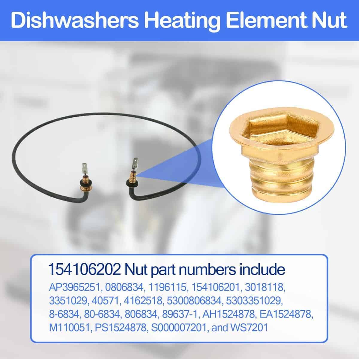 1. Tuerca de elemento calefactor para lavavajillas 154106202. Los números de pieza de la tuerca incluyen AP3965251, 0806834, 1196115, 154106201, 3018118, 3351029, 40571, 4162518, 5300806834, 5303351029, 8-6834, 80-6834, 806834, 89637-1, AH1524878, EA1524878, M110051, PS1524878, S000007201 y WS7201.