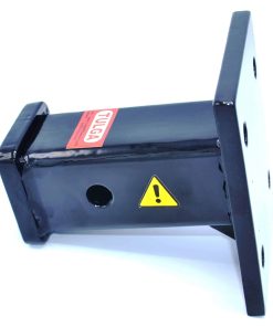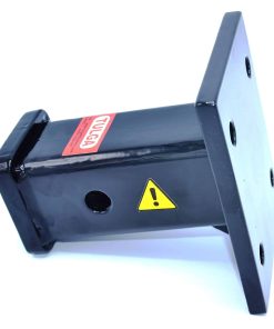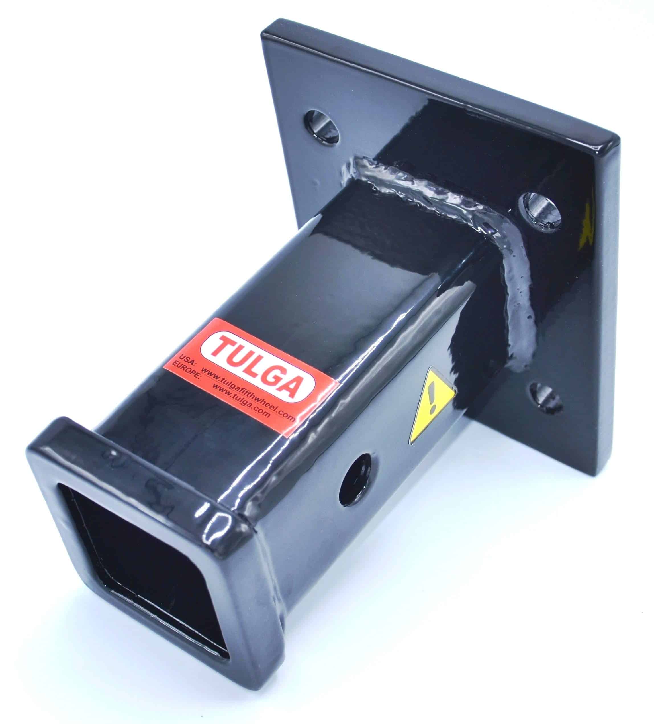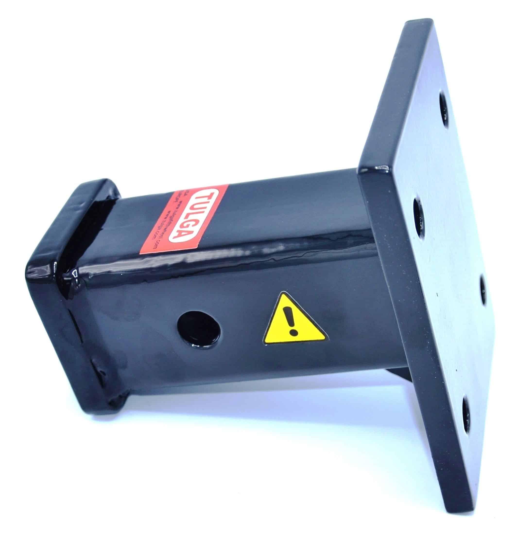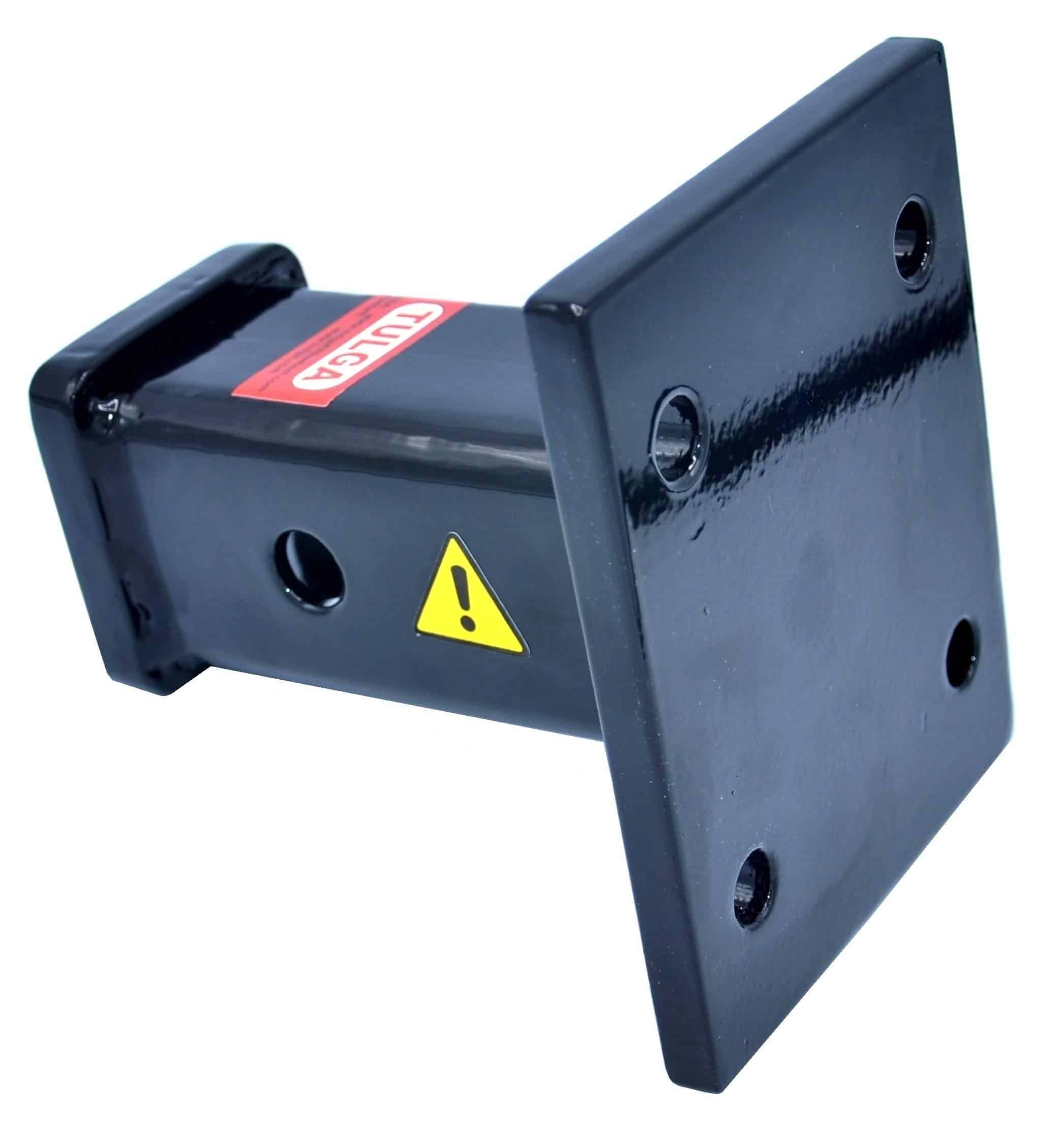 El tubo receptor de acero de 2 pulgadas está soldado a una placa de montaje de 1/2 pulgada de grosor que se atornilla al vehículo.